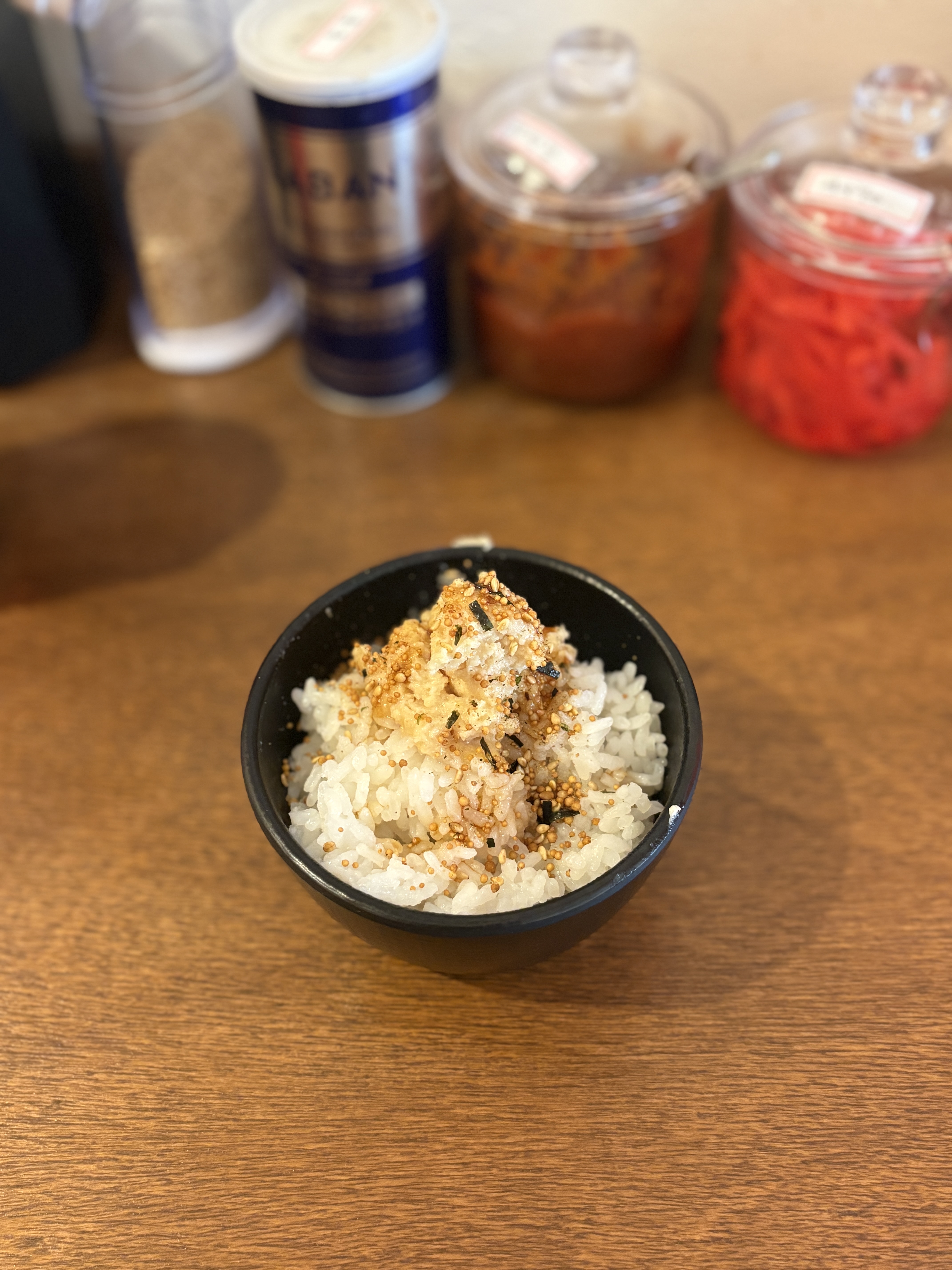 라멘을 기다리는 사이에 무료밥에 세아부라와 후리가케를 얹어 주린 배를 채워봅니다. 멘야코이시의 이 세아부라는 정말 매력있네요.