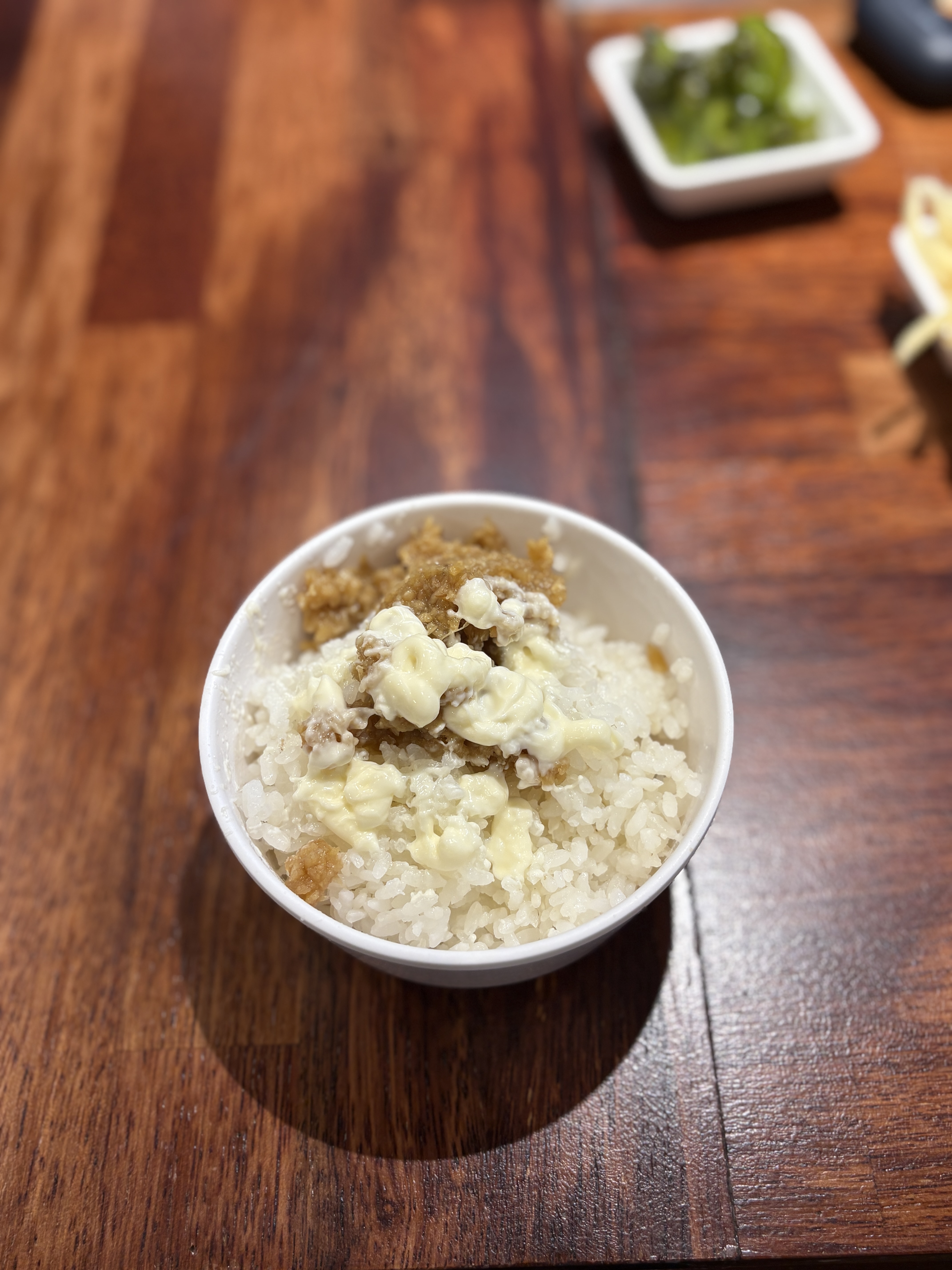 하쿠텐에서는 공짜밥 인심이 후하기로 유명하죠. 라멘도 1그릇에 10,000원인 것을 감안하면 매우 좋은 가격임에 틀림 없습니다. 리뉴얼 이후에 라멘 열풍까지 더해져서 가게에 직원들도 많이 늘었고, 거의 오토를 실현한 상태이기에 이러한 가격 유지가 가능한 것 같습니다. 공기밥에 다진마늘과 마요네즈를 올려 비벼 라멘 수프를 추가해 먹으면 괜찮은 곁들임이 됩니다.