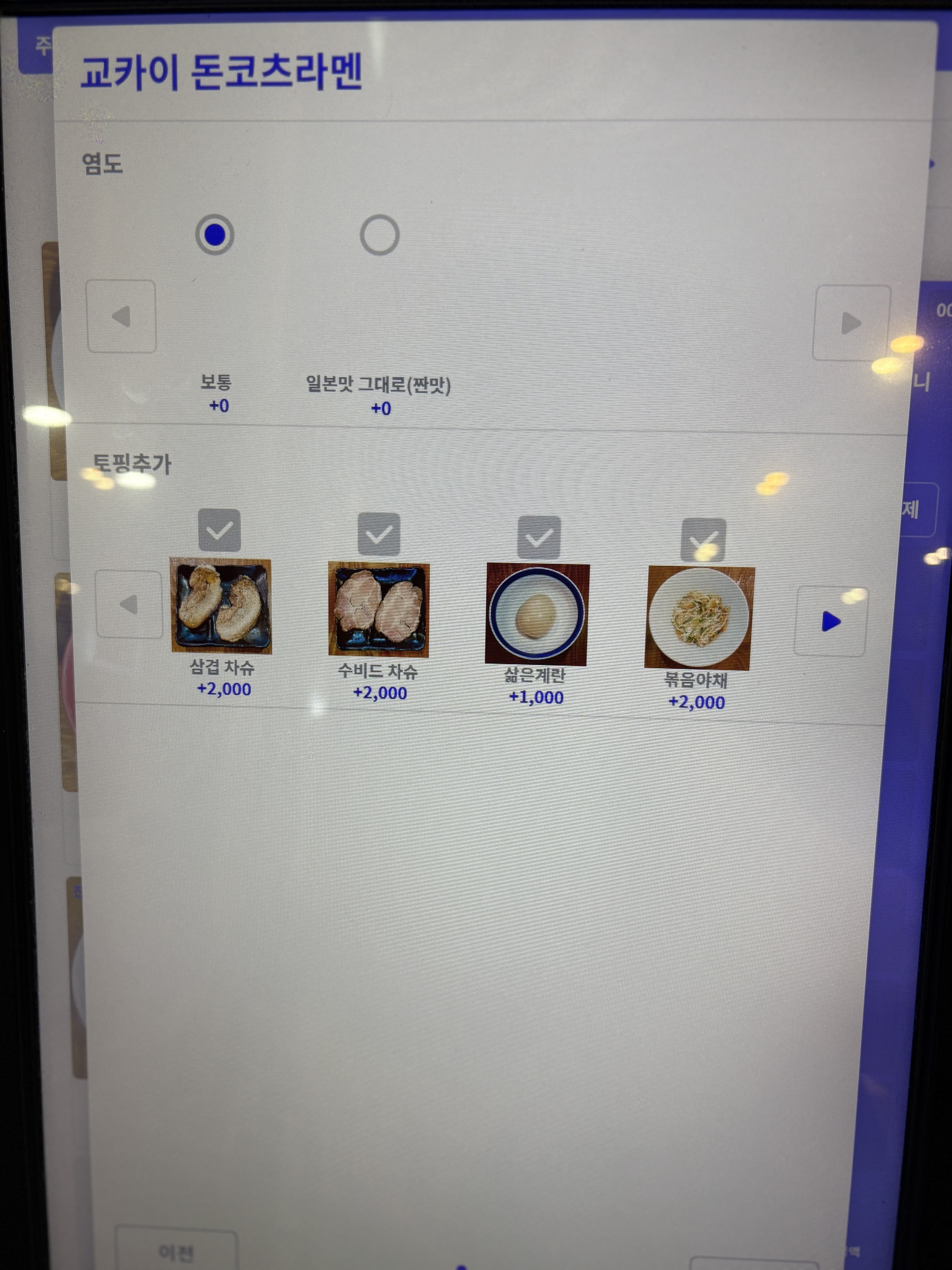 염도를 조절할수있어 일본 맛 그대로를 선택했습니다. 볶은 야채(2,000원) 계란 (1,000원) 삼겹차슈 (2,000원)도 추가.
