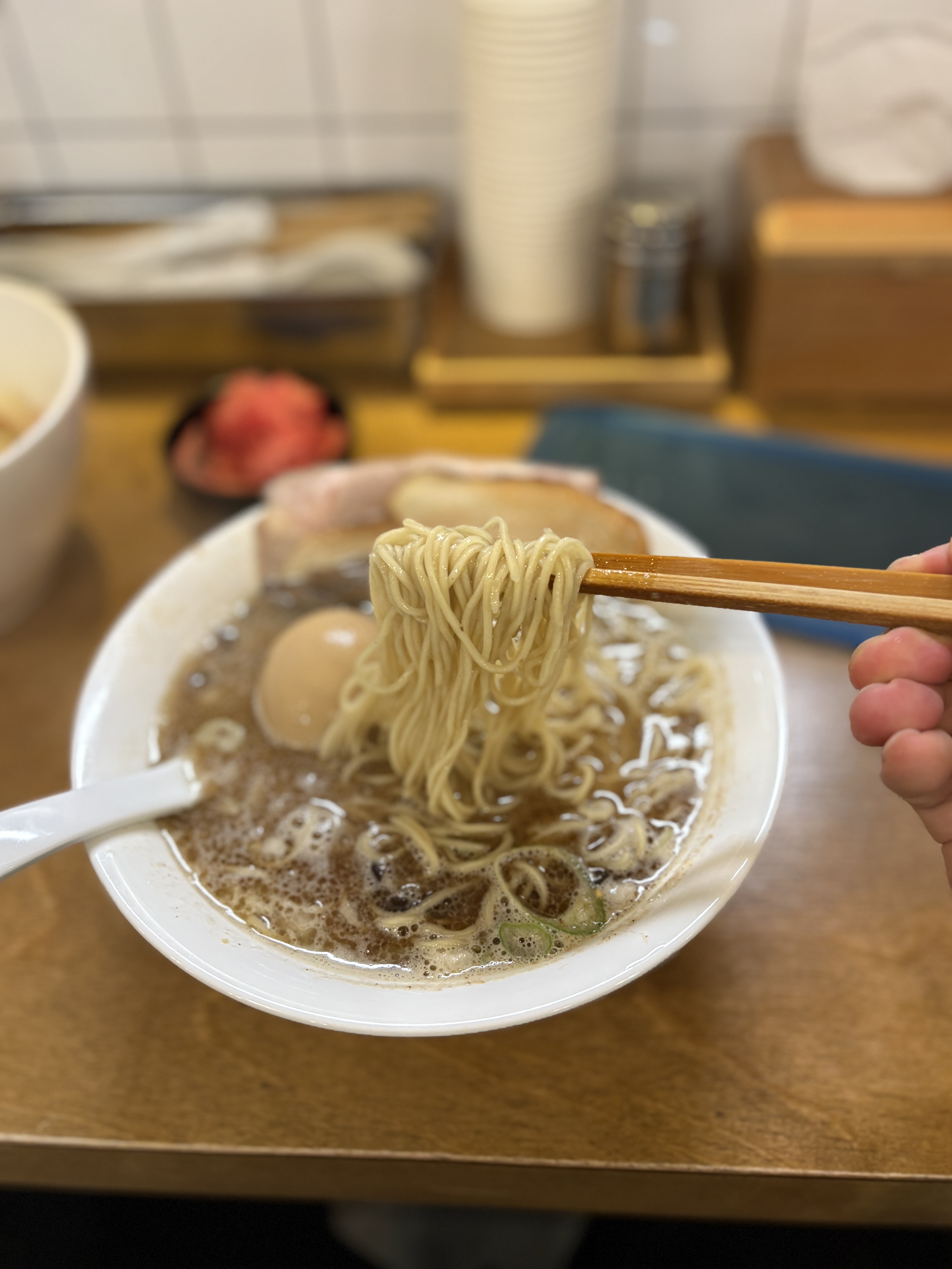 면은 일반적인 호소멘을 사용하셨구요, 규슈지방의 돈코츠라멘집에 가면 가장 많이 만나볼 수 있는 그 굵기와 식감입니다. 익숙하면서도 돈코츠에 가장 잘 어울리는 면이기도 하구요. 면 잘 삶아졌네요.