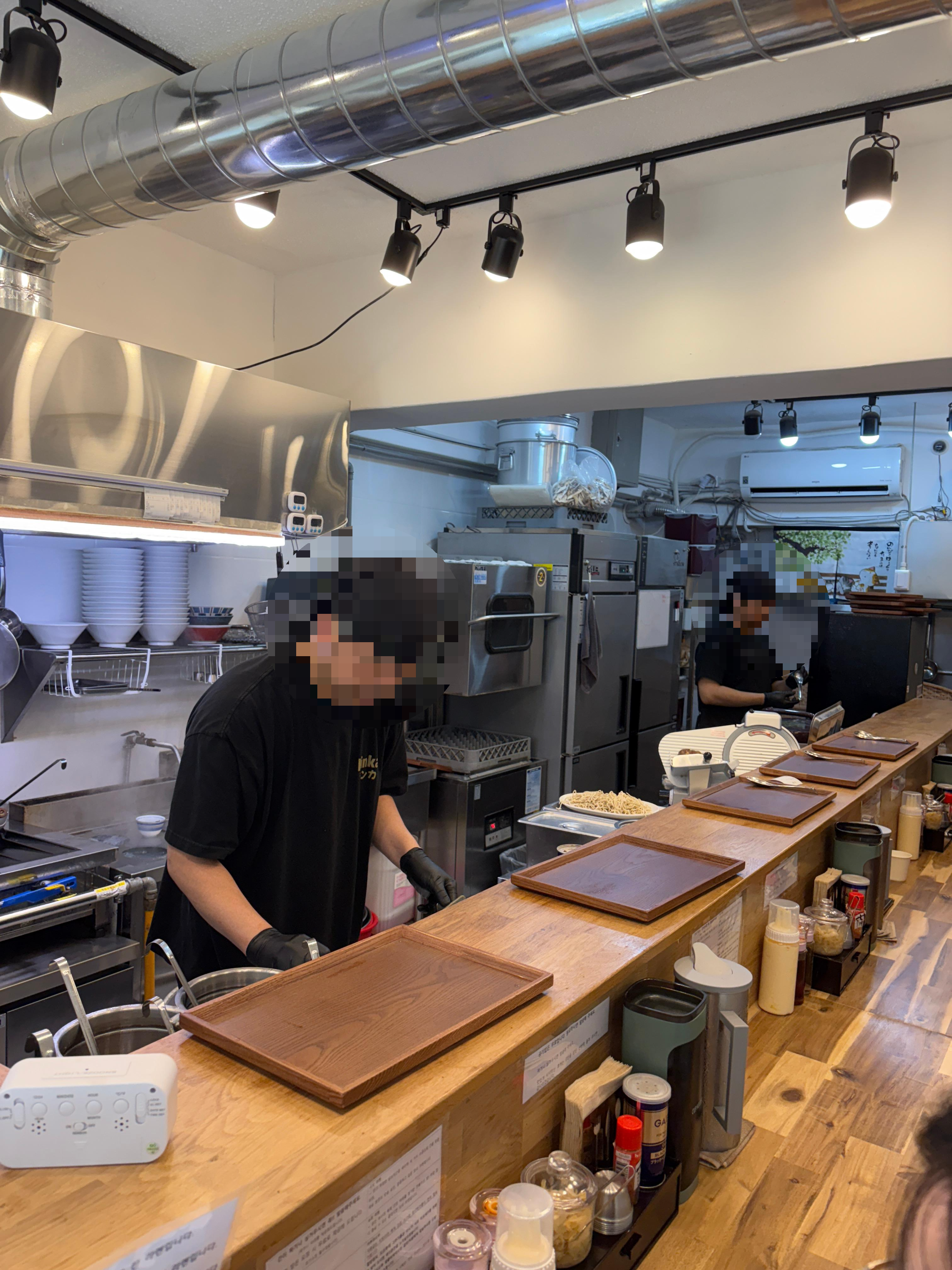 매장에 들어가봅니다. 좌석은 모두 다찌좌석으로 마련되어있구요, 10좌석 남짓 되는 규모의 업장이었습니다. 두분이서 조리 및 서빙을 모두 담당해주시구요, 서비스 방식은 전형적인 다찌석으로 된 라멘집과 같습니다. 위치가 위치다보니 직장 점심시간과 겹치면 극악의 웨이팅을 자랑하지만 전 점심시간이 조금 지난 시간에 방문하여 바로 입장 가능했습니다.