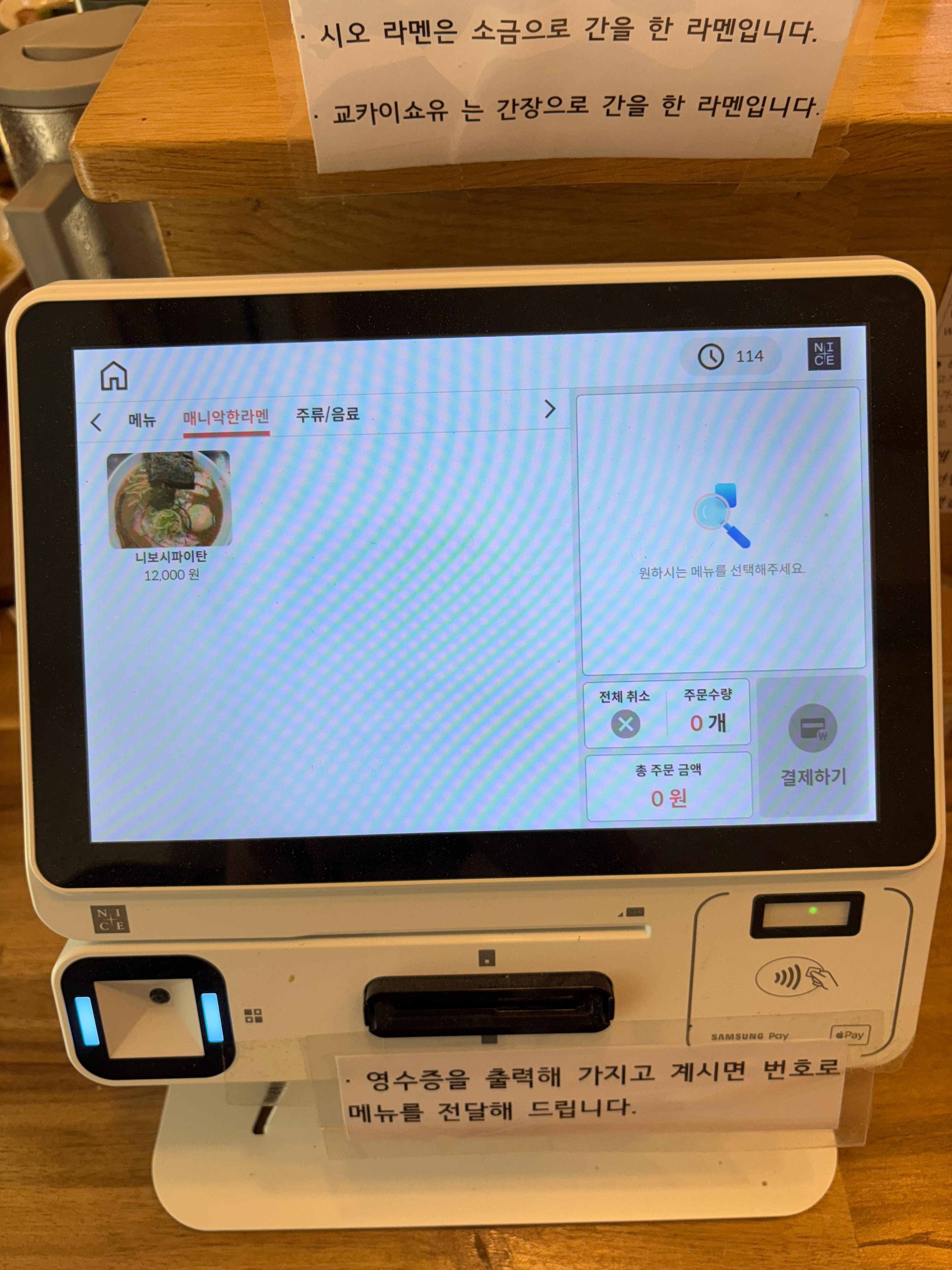 주문은 키오스크를 이용해서 하는 시스템이구요, 제가 먹고싶은 니보시파이탄은 매니악 섹션에 따로 있네요 ㅎㅎ 가라아게 등의 사이드는 판매하고 계시지 않습니다. 공기밥은 무료로 제공되는 점 좋았습니다.
