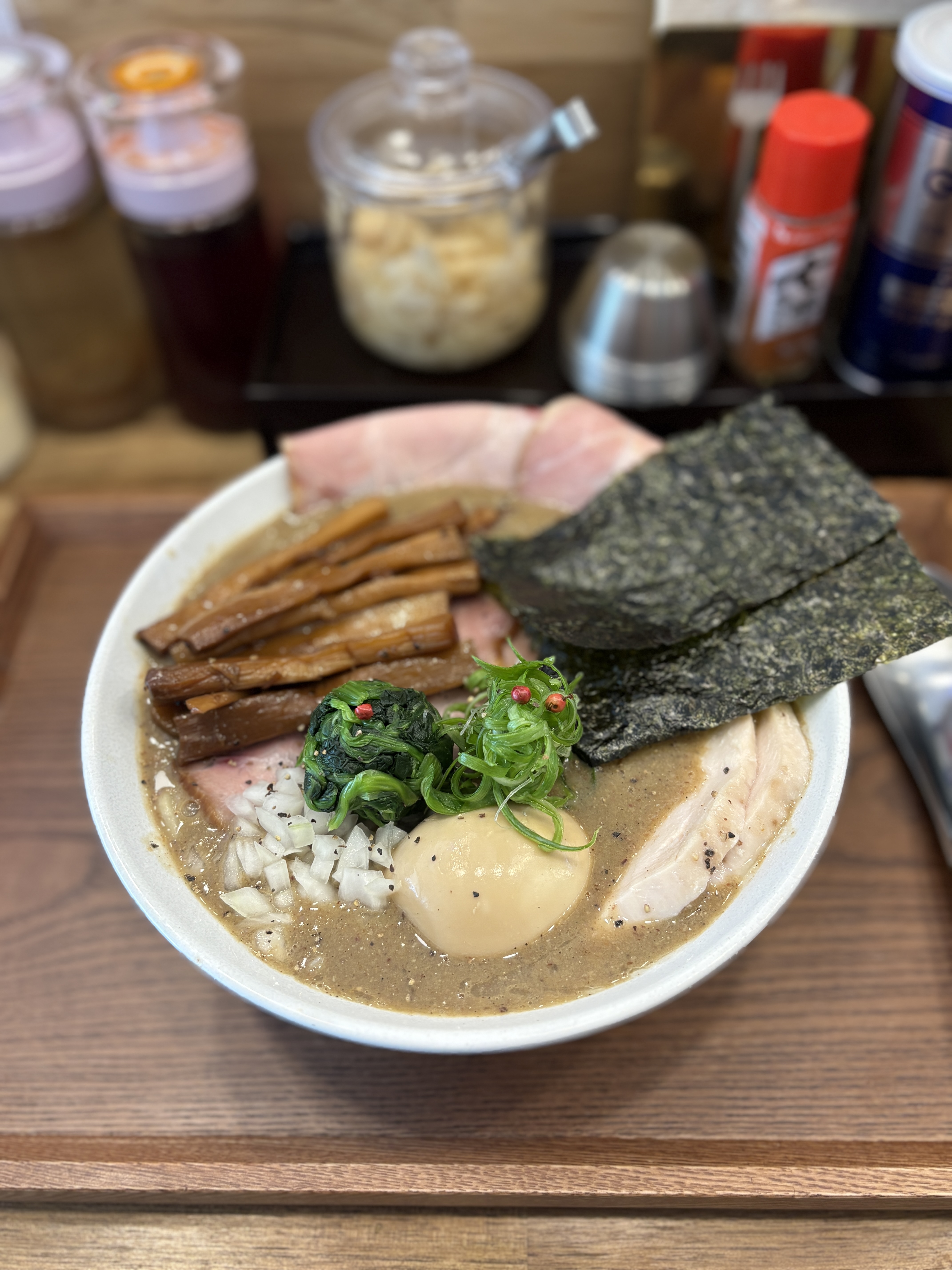 먼저 주문한 니보시파이탄 (12,000원)이 나왔습니다. 개인적으로 좋아하는 멘마도 추가했구요(1,500원), 시금치가 올라와있는게 특징입니다. 일부 라멘 덕후분들이 예민한 잘게썬 생양파도 있네요 ㅋㅋ 제가 좋아하는 전형적인 니보시파이탄의 외형을 갖추고있습니다. 눈으로 보아도 그 녹진함이 느껴지네요.