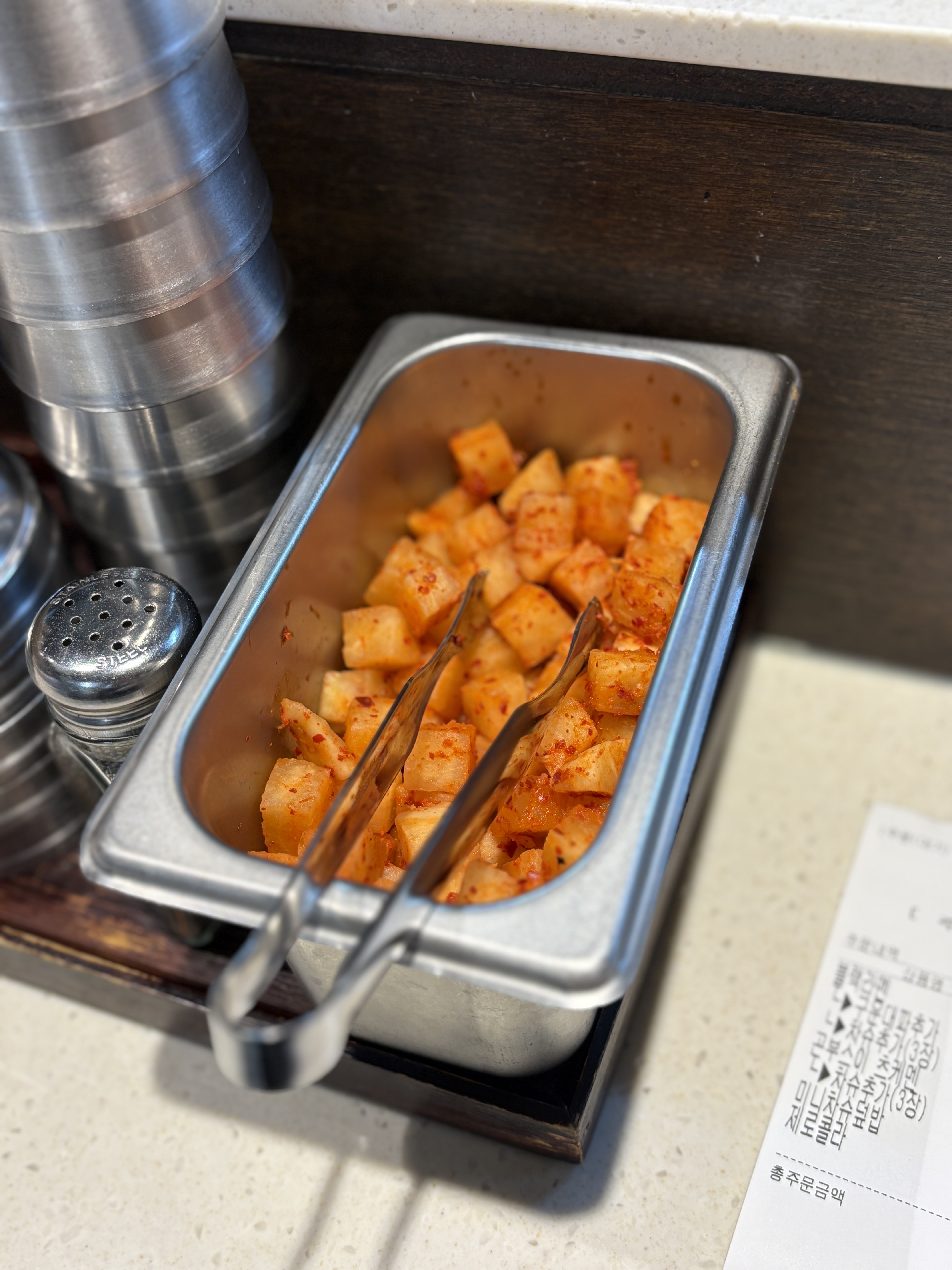 라멘집으로는 특이하게 밑반찬으로 깍두기만 제공됩니다 ㅎㅎ 돈코츠 계얄에서는 김치가 보이는 경우도 있는데, 초생강없이 깍두기만 제공되는건 좀 특이한 것 같아요.