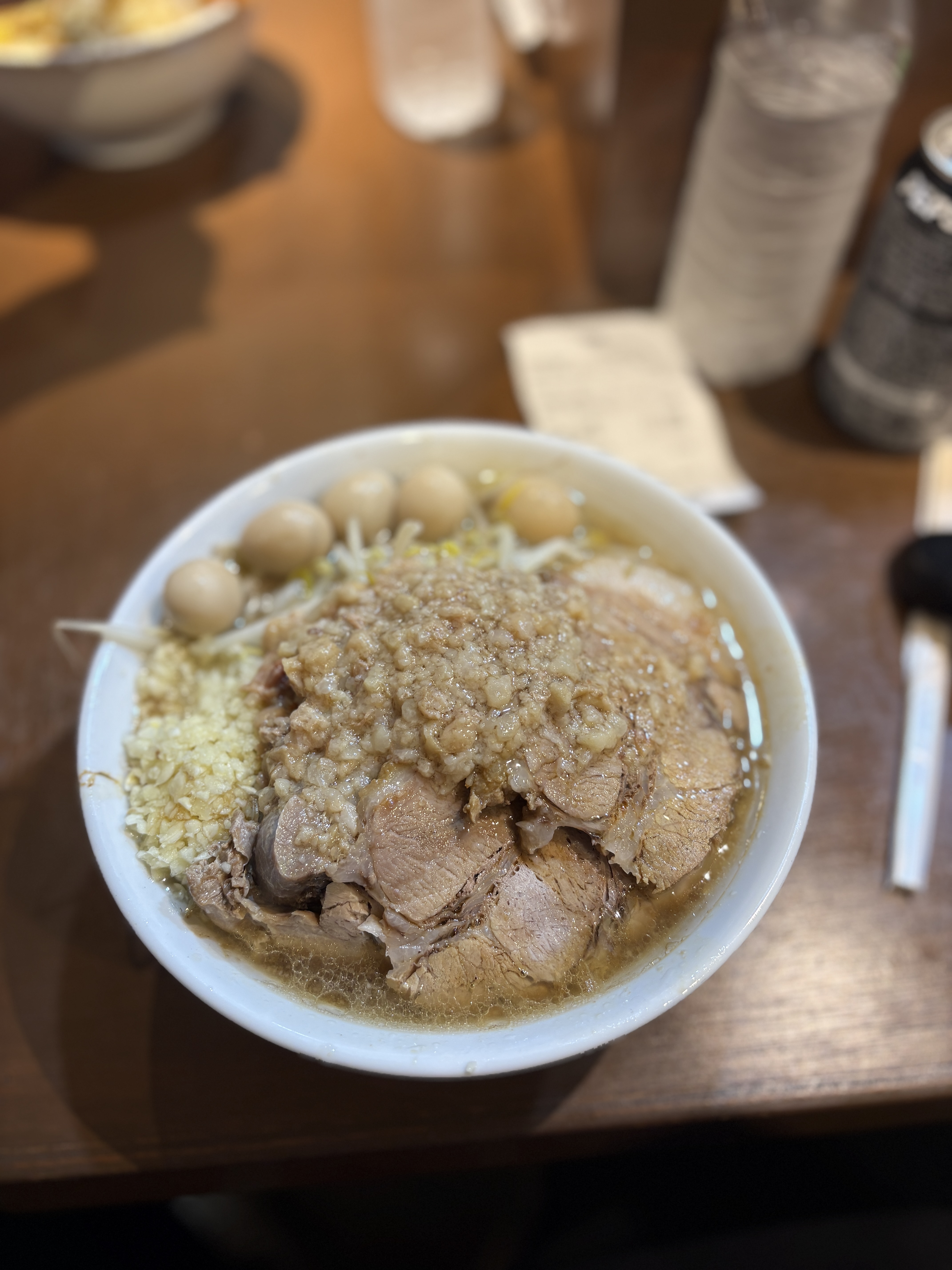 지로계 라멘의 특징 중 하나인 칼국수처럼 굵은 면입니다. 이 면발이 자극적인 육수와 마늘, 기름을 한껏 머금고 빨아올려서 모든 감칠맛의 소용돌이를 일으킵니다. 비주얼도 폭력적이지만 씹는 식감이나 그에 딸려오는 토핑들의 맛도 매우 자극적이어서, 면을 후루룩 먹는 순간 "아 아들 결혼식은 보고 죽어야하는데 이대로 계속 먹어도 되나"라는 생각이 날 정도로 머리를 강하게 때리는 자극적인 맛이었습니다.