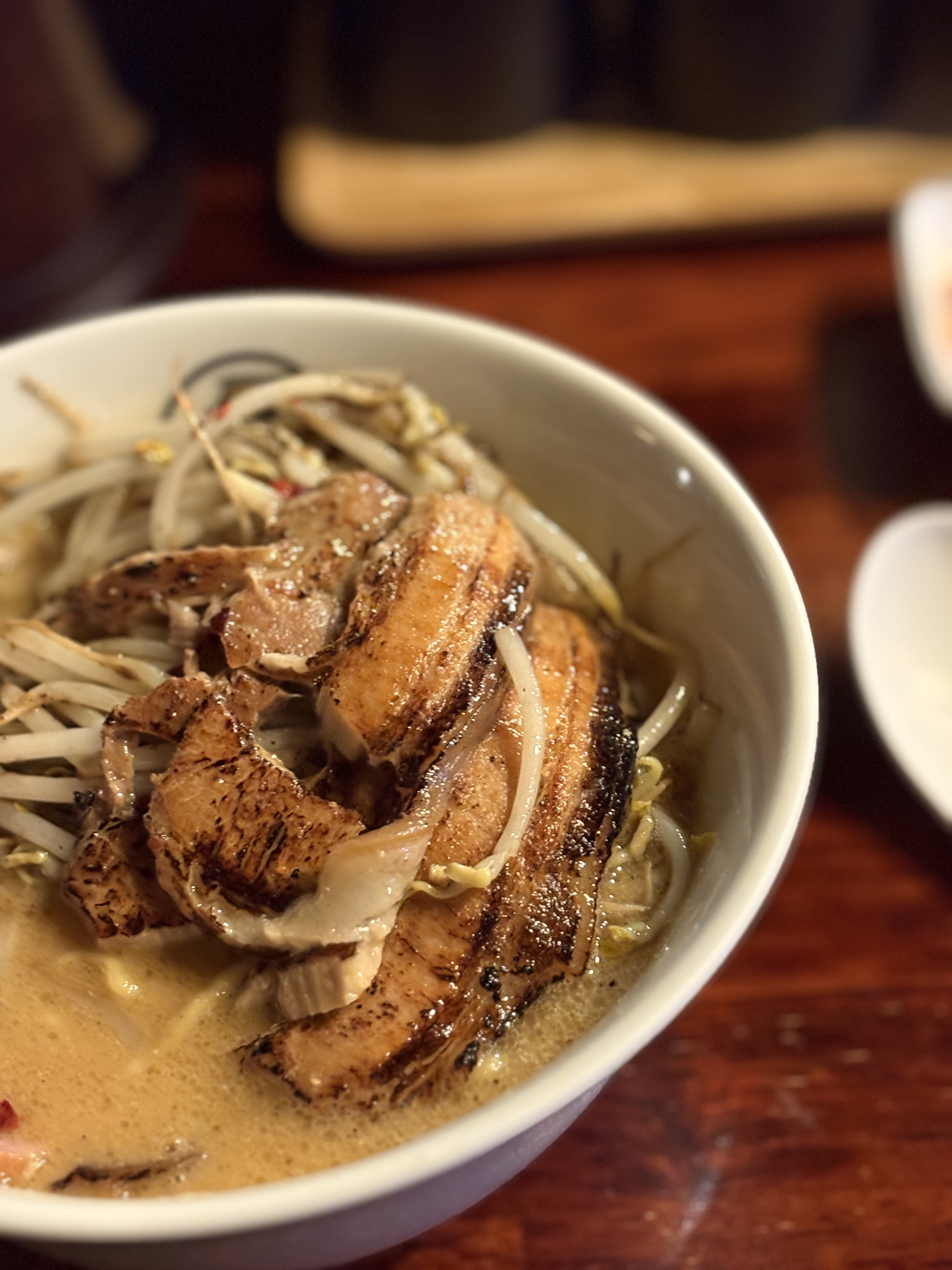 진하게 빛나는 미소 스프 위로 잘 볶아진 숙주가 올라와있습니다. 크러쉬드 페퍼는 취향 차이가 있을 순 있겠지만 개인적으로 미소라멘은 약간 매콤해야 맛있다는 주의라서 전 좋았어요.