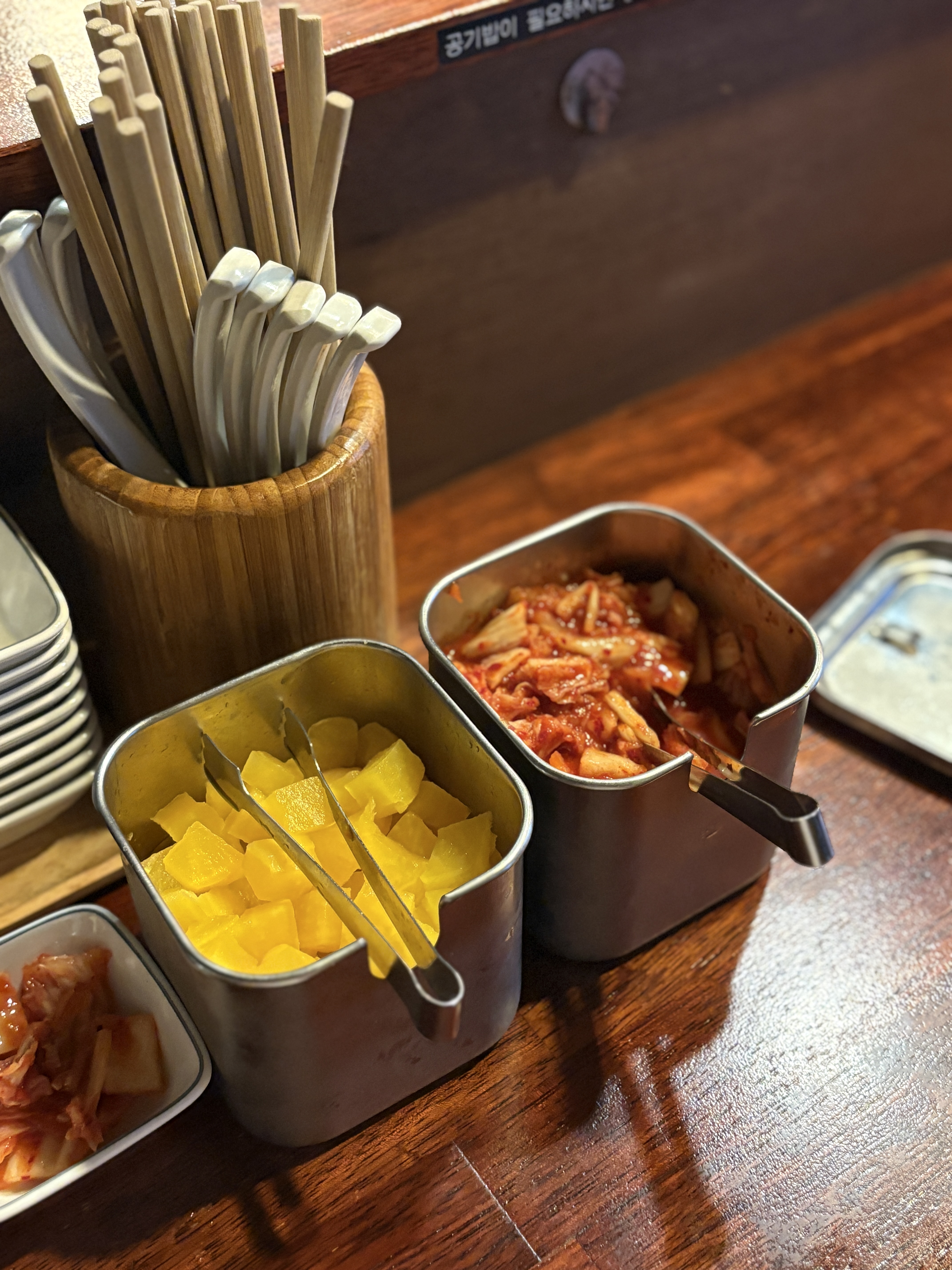 찬들은 김치와 단무지가 준비되어있습니다. 개인적으로는 생강계열을 더 좋아하긴 하지만 미소라멘에는 김치도 잘 어울리죠. 특별할 건 없었습니다.