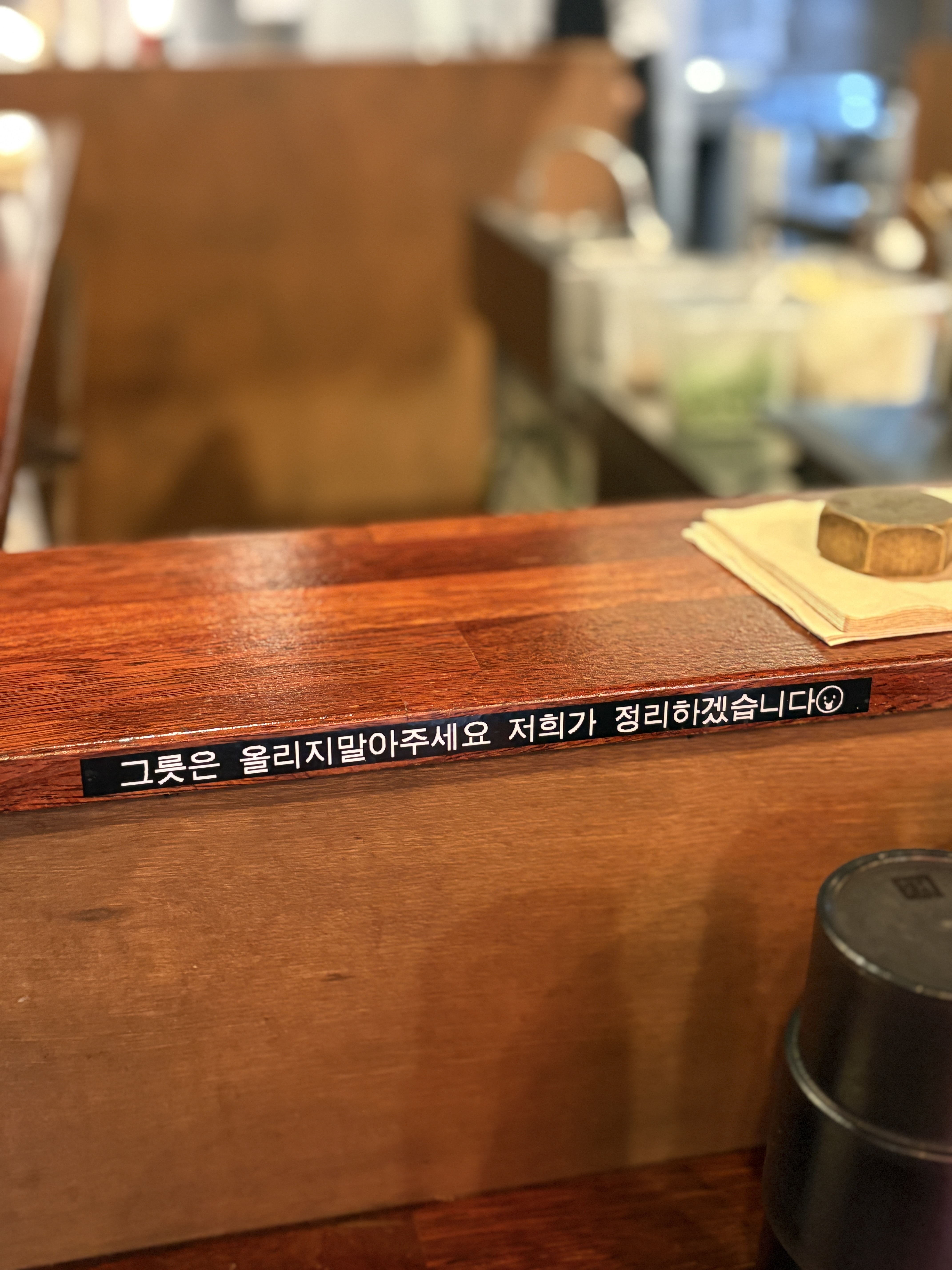 다찌석으로 좌석을 꾸리시는 라멘야들은 대부분 바 테이블 앞에 "다 드신 그릇은 위에 올려주세요." 가 적혀있는데 이곳은 반대로 올리지 말라고 적혀있더라구요 ㅎㅎ 뭔가 이벤트가 있었던 것인지 사장님의 배려심인지 모르겠지만 눈에 띄었습니다.