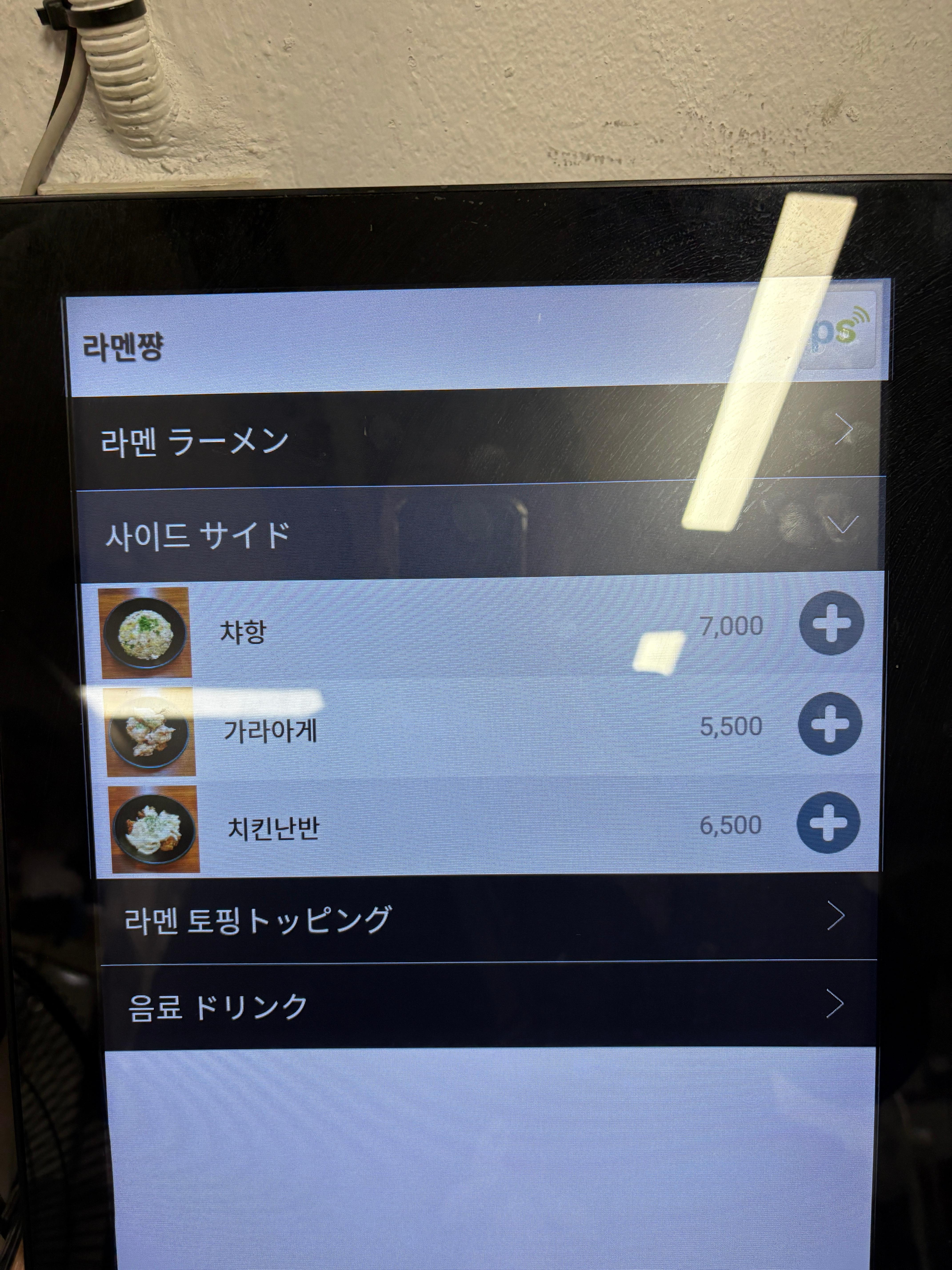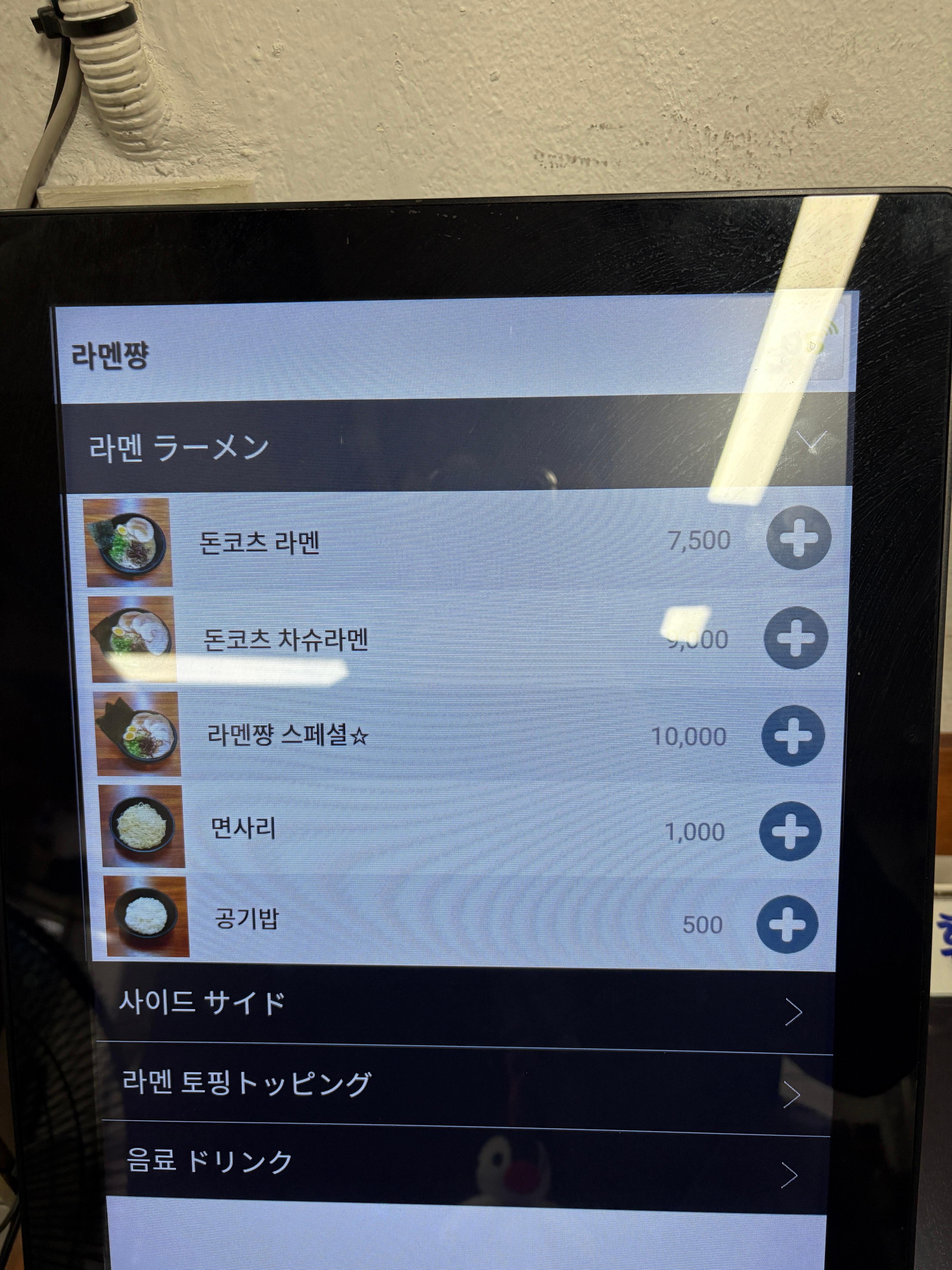 자 키오스크로 메뉴를 한번 살펴보시겠습니다. 돈코츠라멘 7,500원.. 정말 아름다운 가격 아닐까요. 최근에 라멘집에서 이런 가격을 본 적이 있나 싶습니다. 7,500원까지는 안바래도 10,000원 밑의 가격을 본 적이 언젠지.. 풀토핑을 추가해도 10,000원 밖에 안합니다. 그리고 세트메뉴로 챠항도 2,500원이라는 말도 안되는 가격으로 추가가 가능..