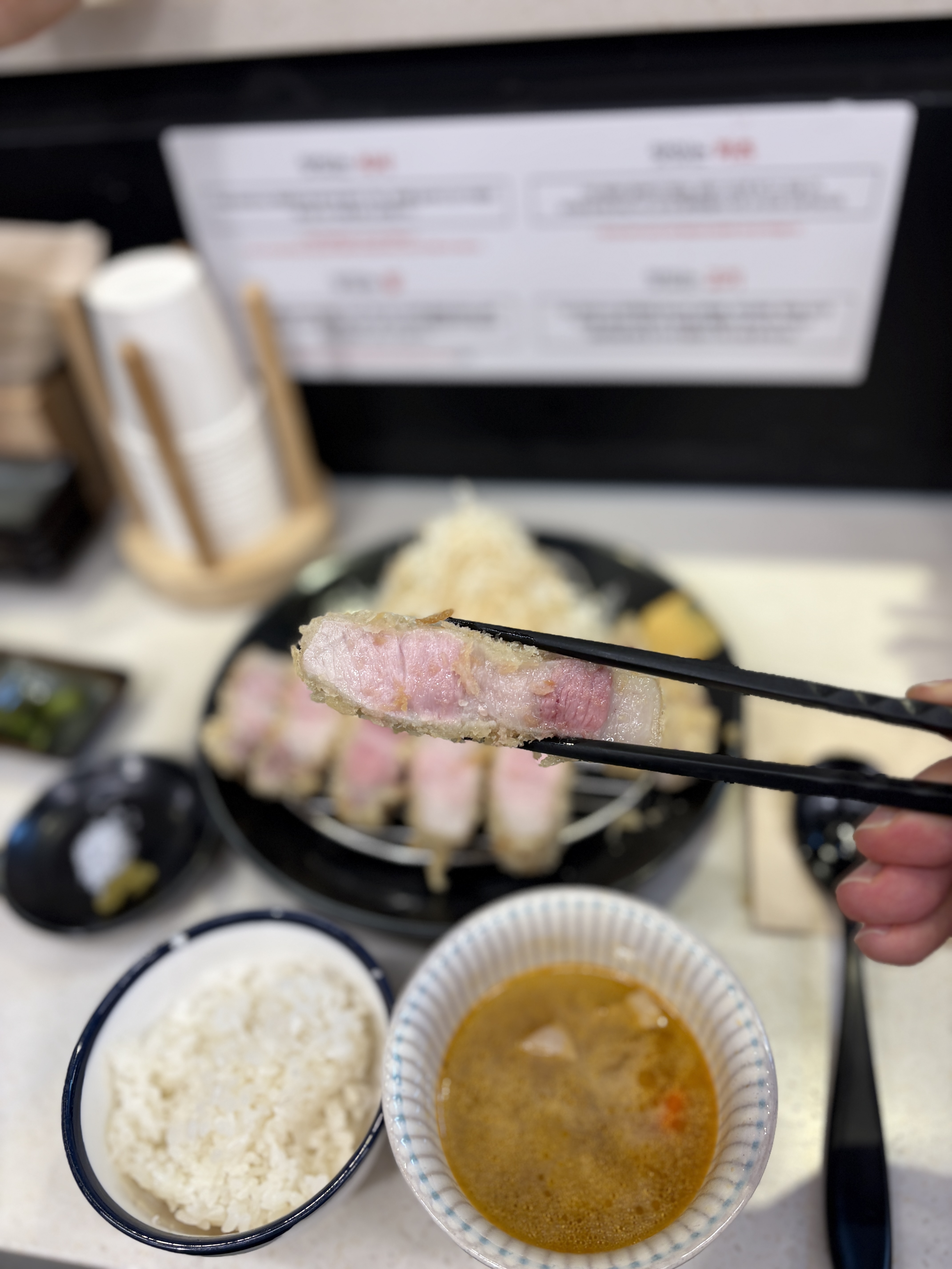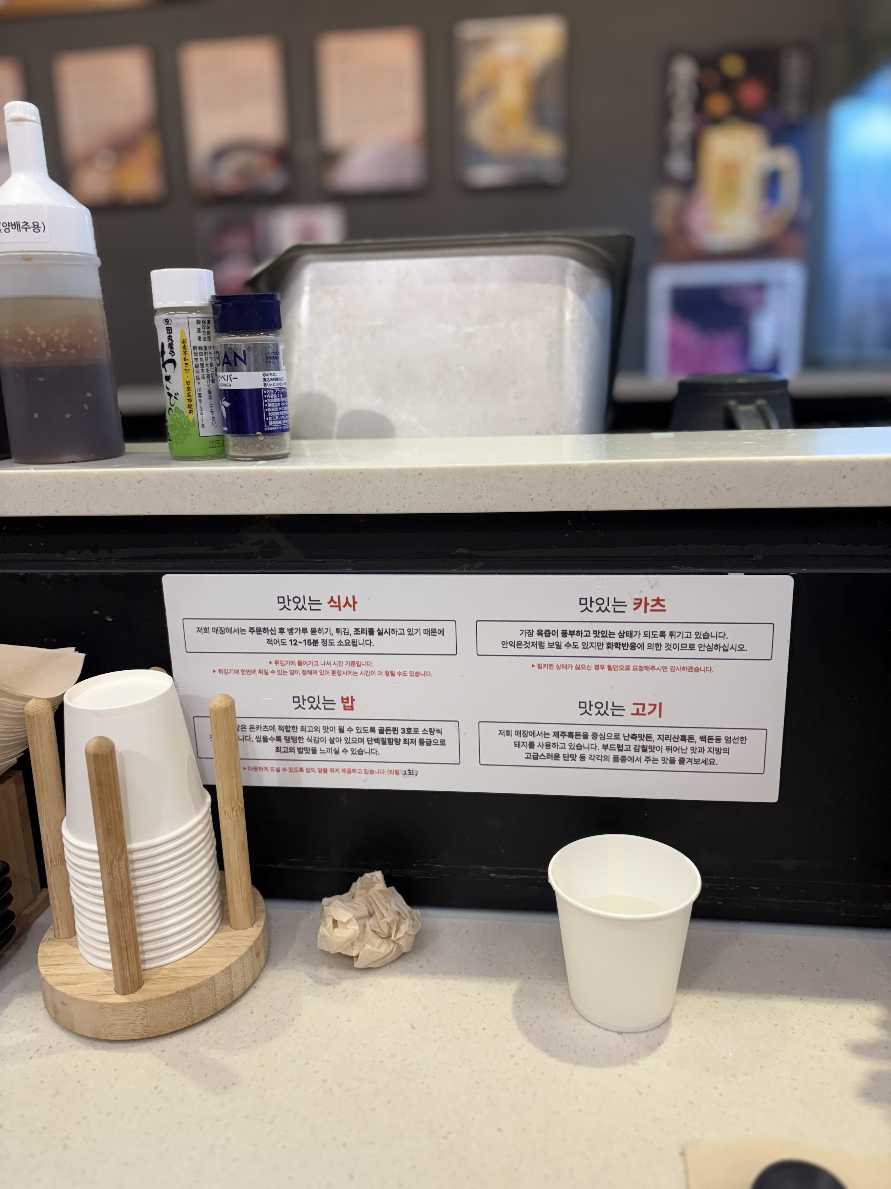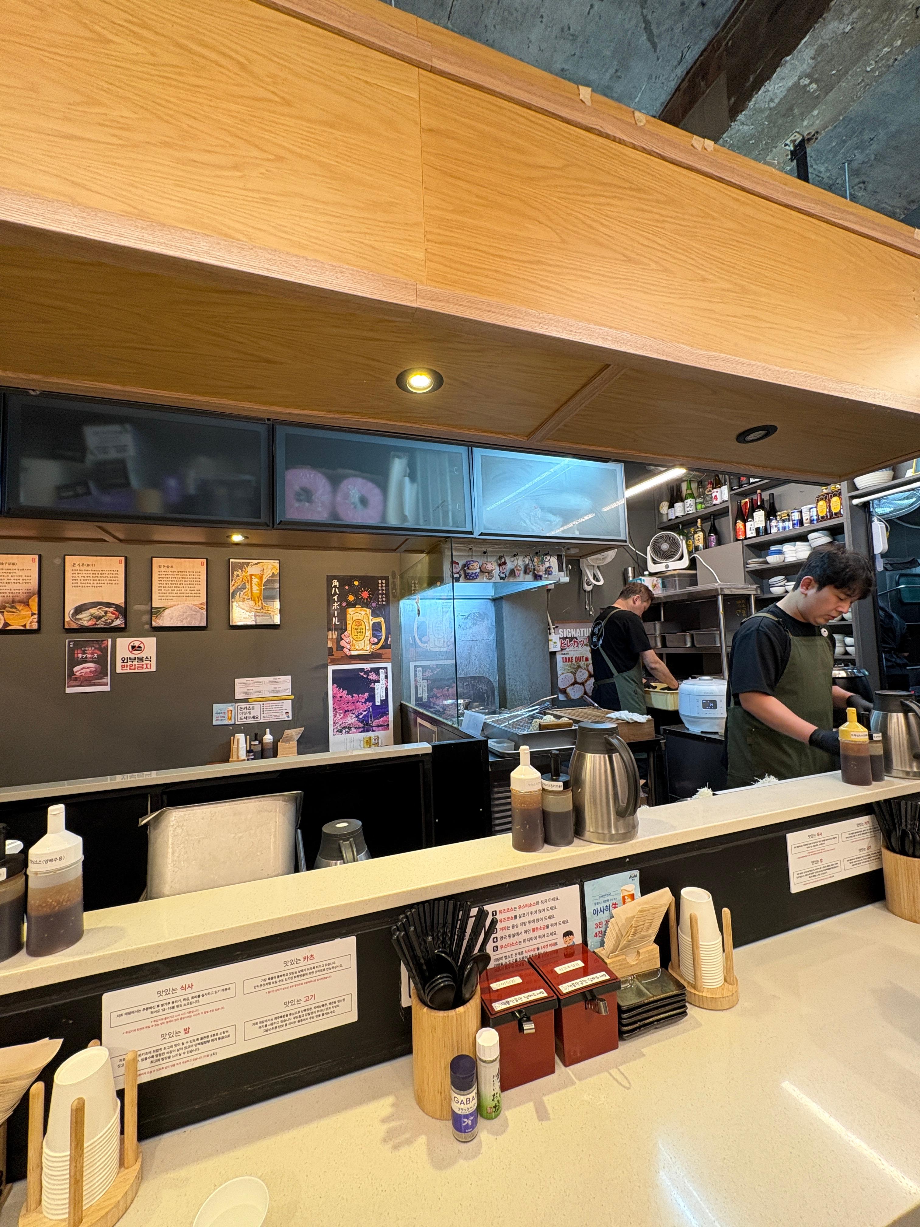 가게 내부는 넓지 않지만 2인 좌석 테이블과 바테이블 등으로 구성되어있었습니다. 의자와 뒤 벽면이 조금은 비좁아서 다른분들 부딪히지 않게 들어가는게 조금 힘들긴 했어요. 그리고 생각보다 좌석이 많지는 않아서 튀겨서 나와야하는 돈카츠다보니 웨이팅이 좀 길어지면 고생좀 하겠다는 생각이..