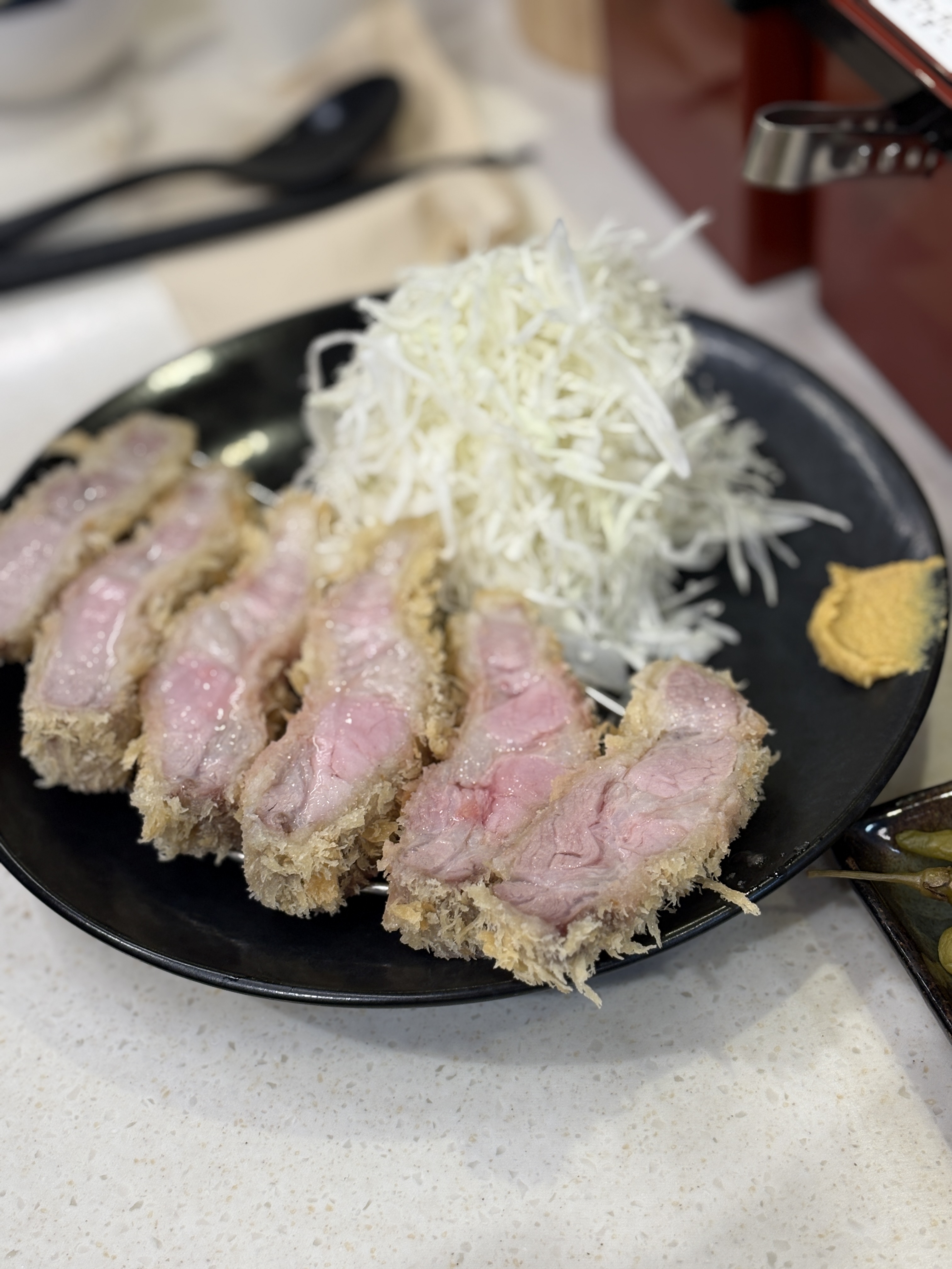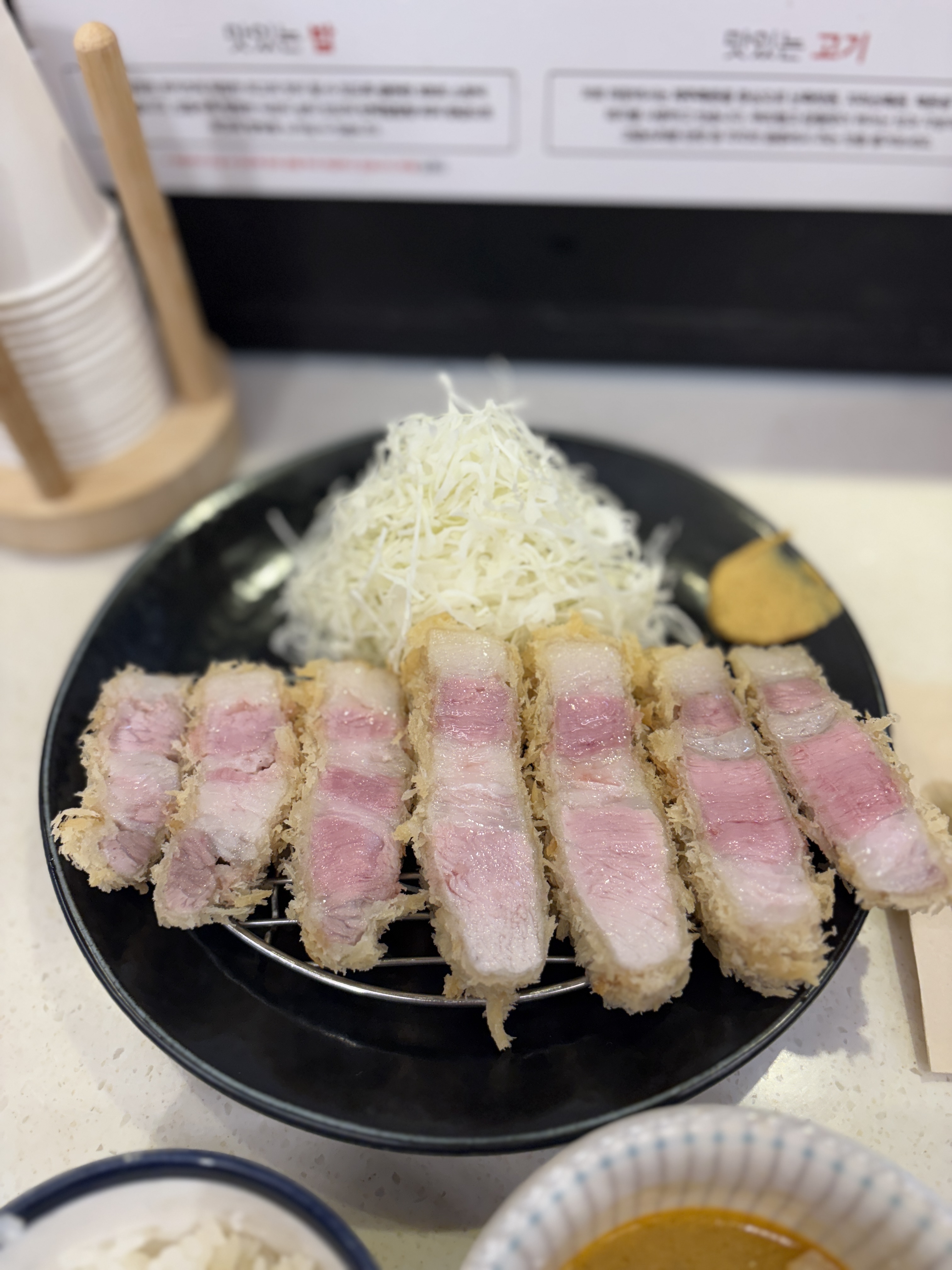 드디어 제가 주문한 돈카츠가 나왔습니다. 전 뼈등심 중 하나인 '상리브로스'를 주문했구요 가격은 28,000원이었습니다. 한국에서 이렇게 비싼 돈카츠를 먹을 줄이야.. 품종은 난축맛돈이었구요 앞서 말씀드린 것처럼 저온조리에 레스팅 시간을 좀 더 주면서 핑크빛이 예쁘게 감도는 완벽한 돈카츠입니다. 혼을 다해서 튀기신다는 사장님의 말씀이 진짜였네요..