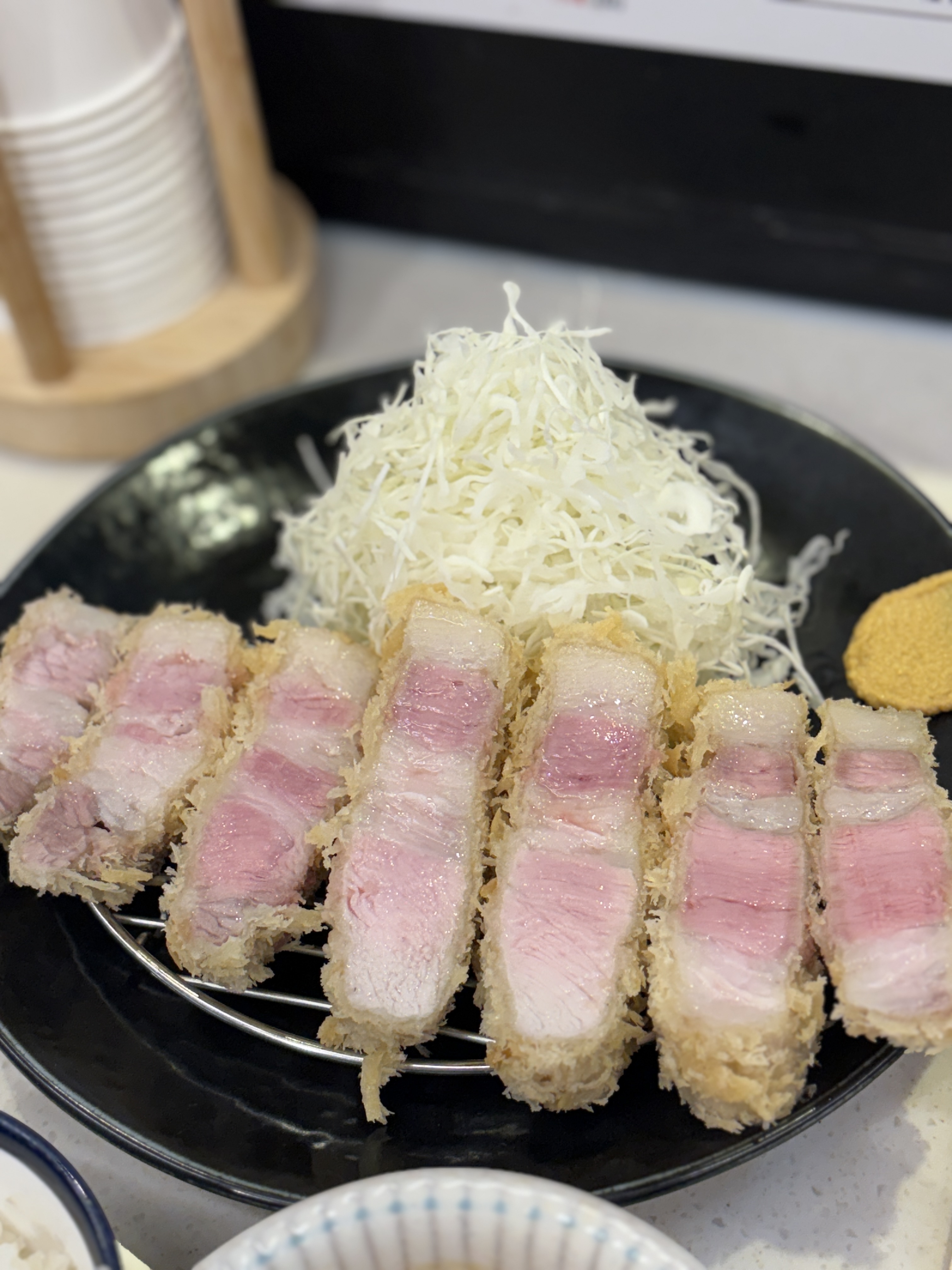 튀김옷 색을 보니 제가 좋아하는 고온에 튀긴 돈카츠는 아니지만.. 튀기는 시간과 레스팅 타이머를 보니 왠지 단면이 기대되는 돈카츠였습니다.