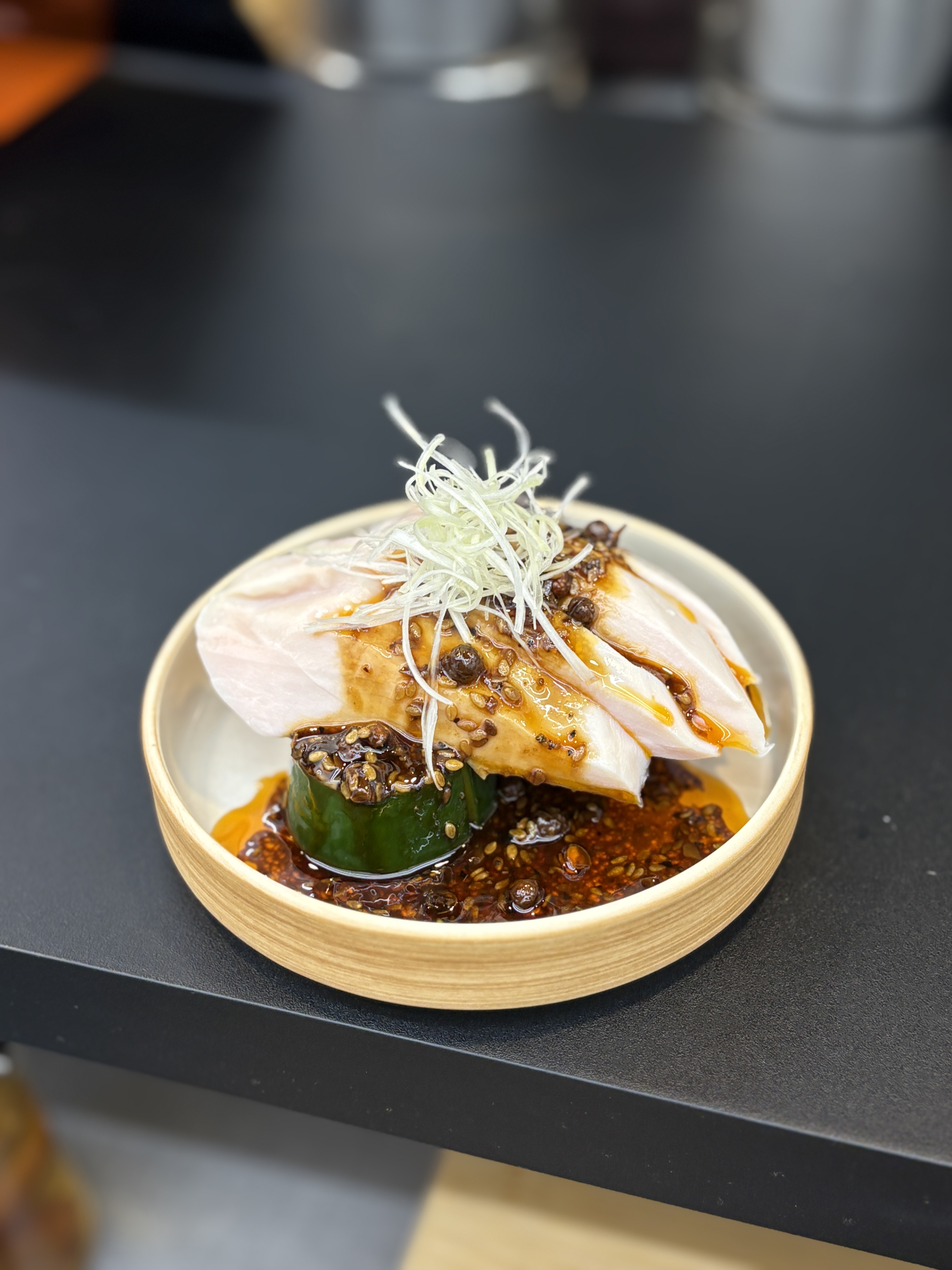 인스타 게시글 설명을 보면 고추기름, 흑식초, 화자오 등으로 만든 소스를 수비드한 닭에 부어서 내어주시는 요리라고 합니다.