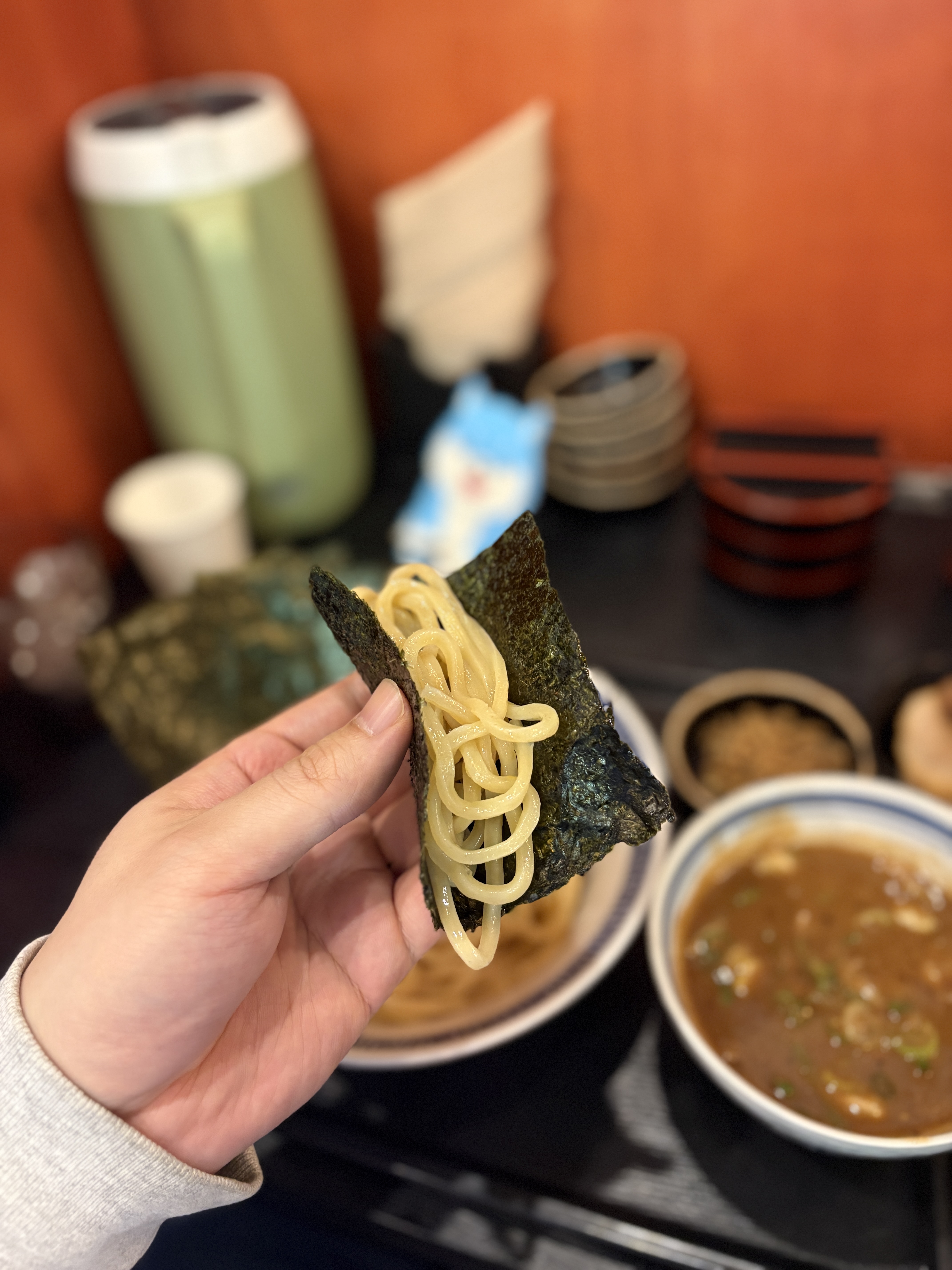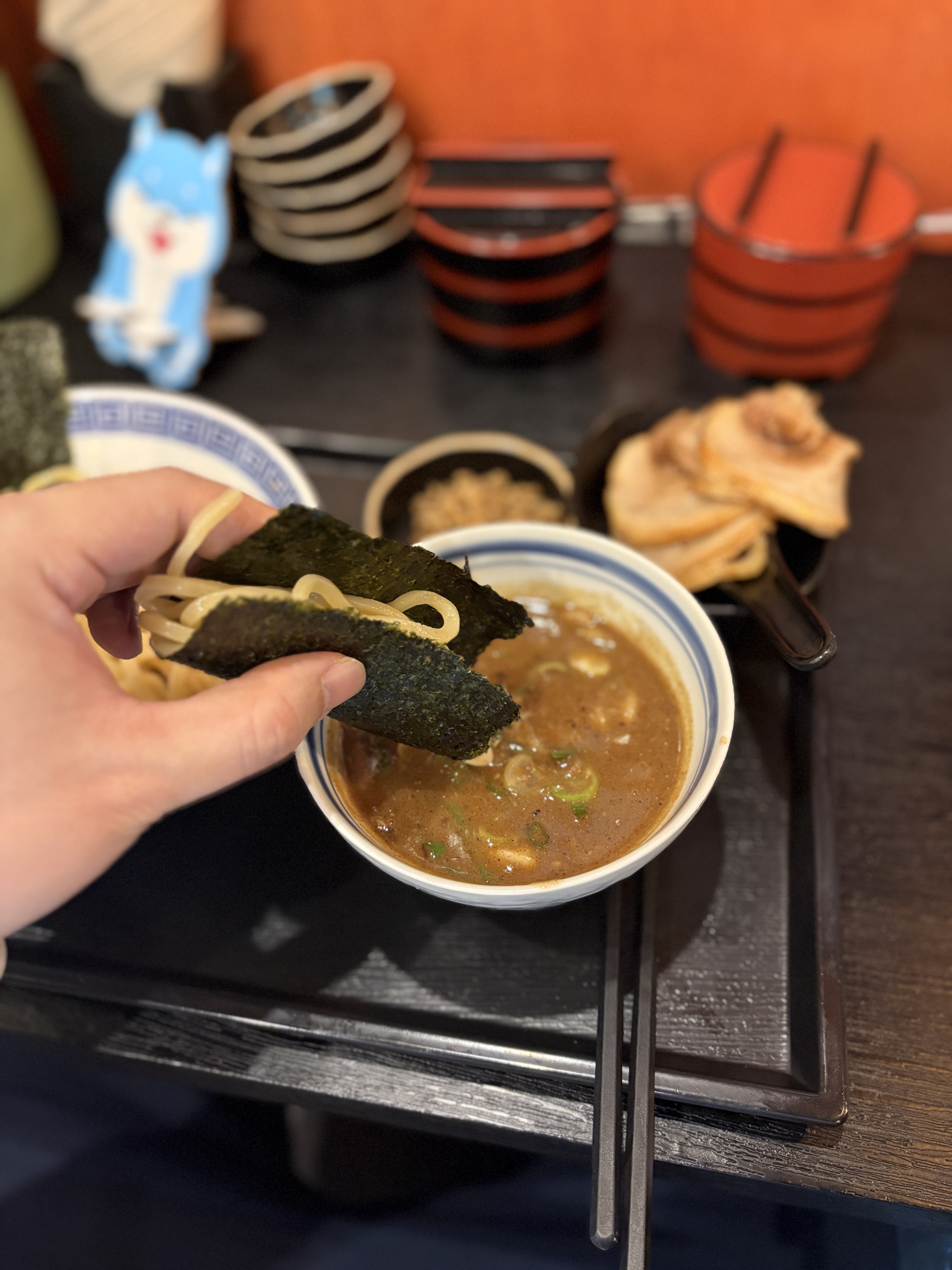 그 맛을 잊지 못하고 다음엔 츠케멘을 맛보러 방문했습니다. 역시나 기대를 실망시키지 않는 훌륭한 츠케멘이었는데요. 이날 방문에는 차슈와 멘마 ,그리고 김을 추가해서 먹었습니다. 넉넉한 김 5장 보이시죠? ㅎㅎ 멘마는 거의 면을 다 덮어버렸네요.