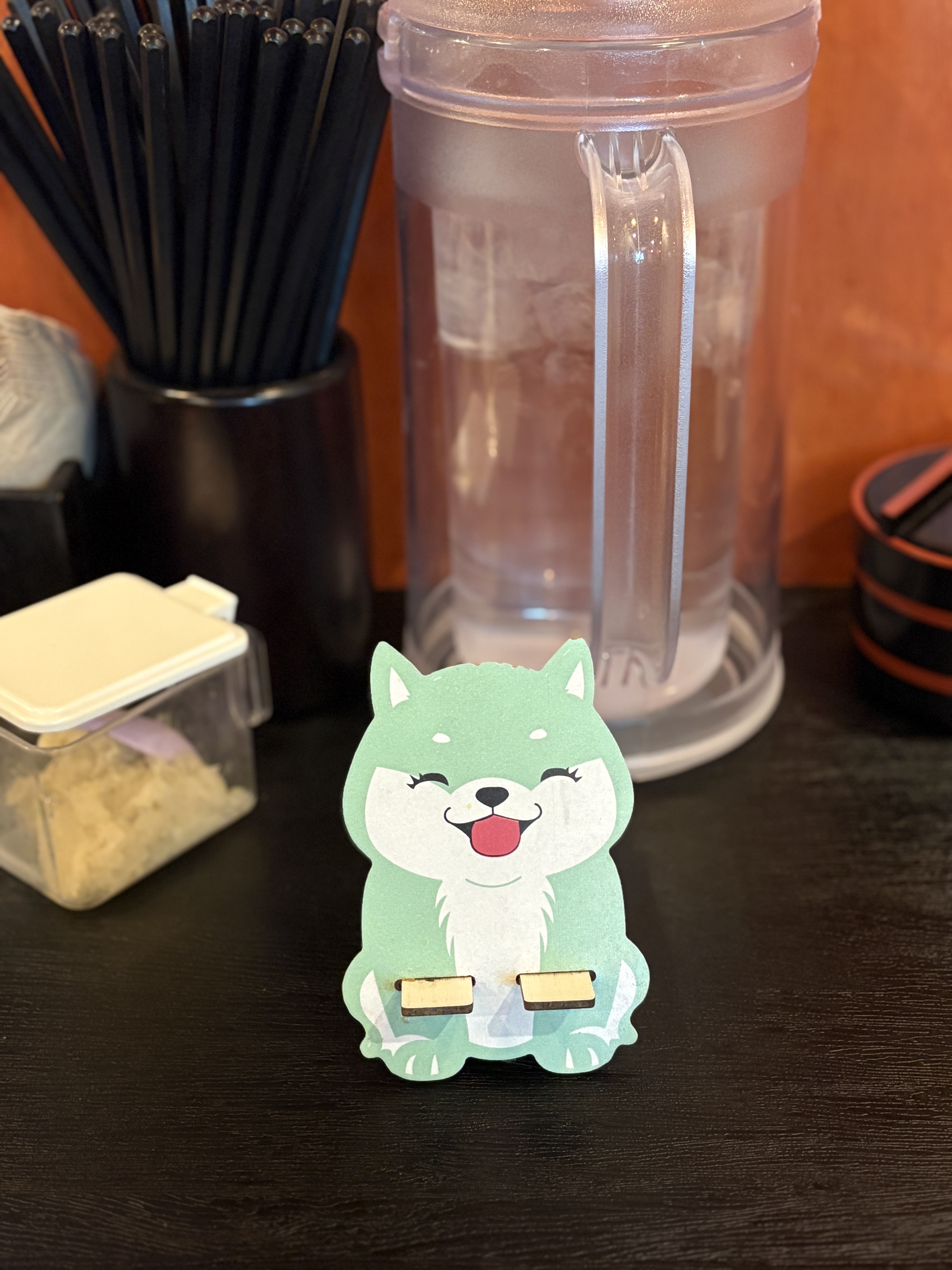 혼자 먹는 다찌석에는 식사하면서 핸드폰으로 유튜브를 보시는 손님들도 많기 때문에 이렇게 거치대를 구비해두셨습니다. 손님에 대한 배려가 하나하나 보이는 소품들입니다. 아주 귀여운 강아지 거치대가 있네요. 이런 배려 하나하나가 더욱 멘야시노기를 기억에 남게 만드는 것 같습니다.