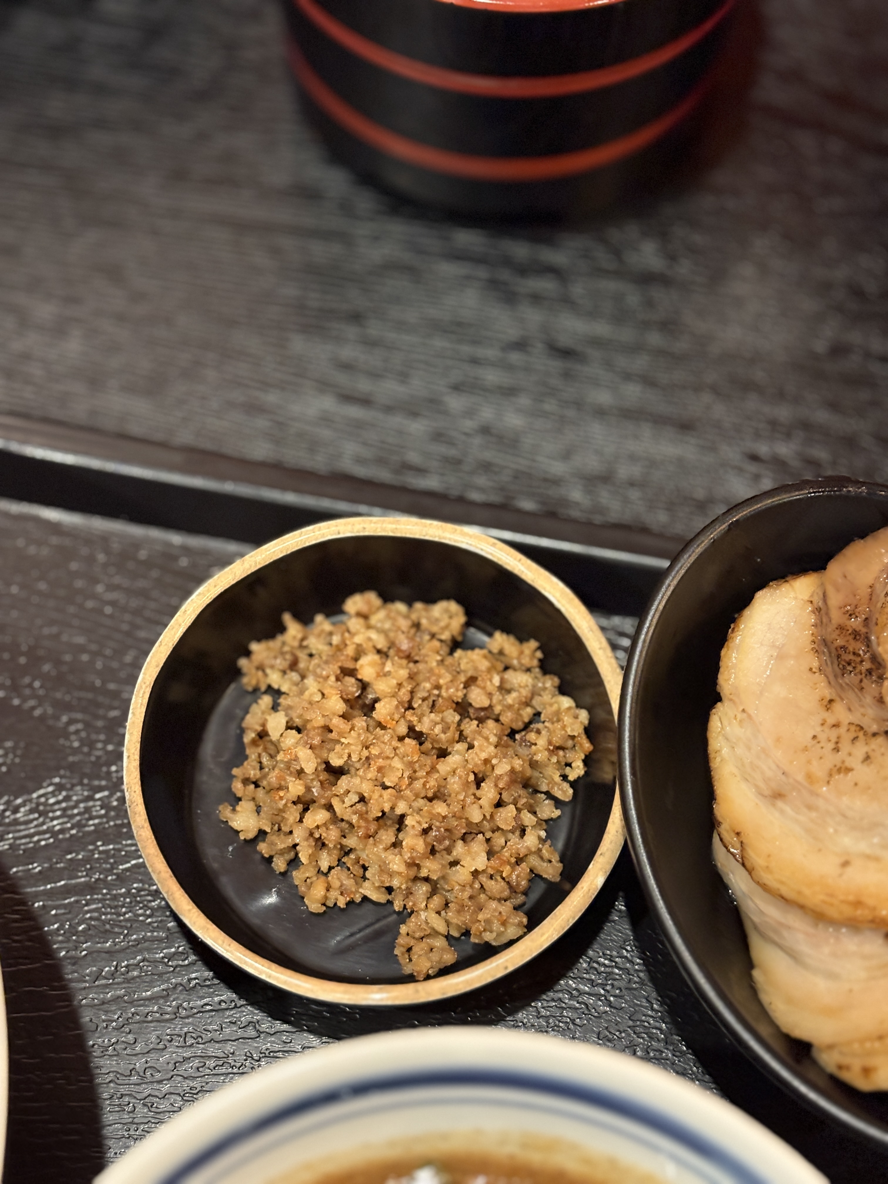 독특했던게 바로 요건데요. 일반적으로 츠케멘을 시키면 볼 수 있는게 아니어서 안주인분께 여쭤봤더니 돼지기름을 튀긴거라고 하시더라구요. 약간 맛이 찹쌀을 튀긴 아라레 처럼 재미난 식감이 지방의 고소함과 짭쪼름함이 같이 올라와서 되게 재밌었어요. 츠케지루에 섞어서 먹으면 시루가 딸려 올라올 때 요 지방튀김이 같이 딸려올라와서 입안에서 춤추듯이 돌아다녀 재밌습니다.