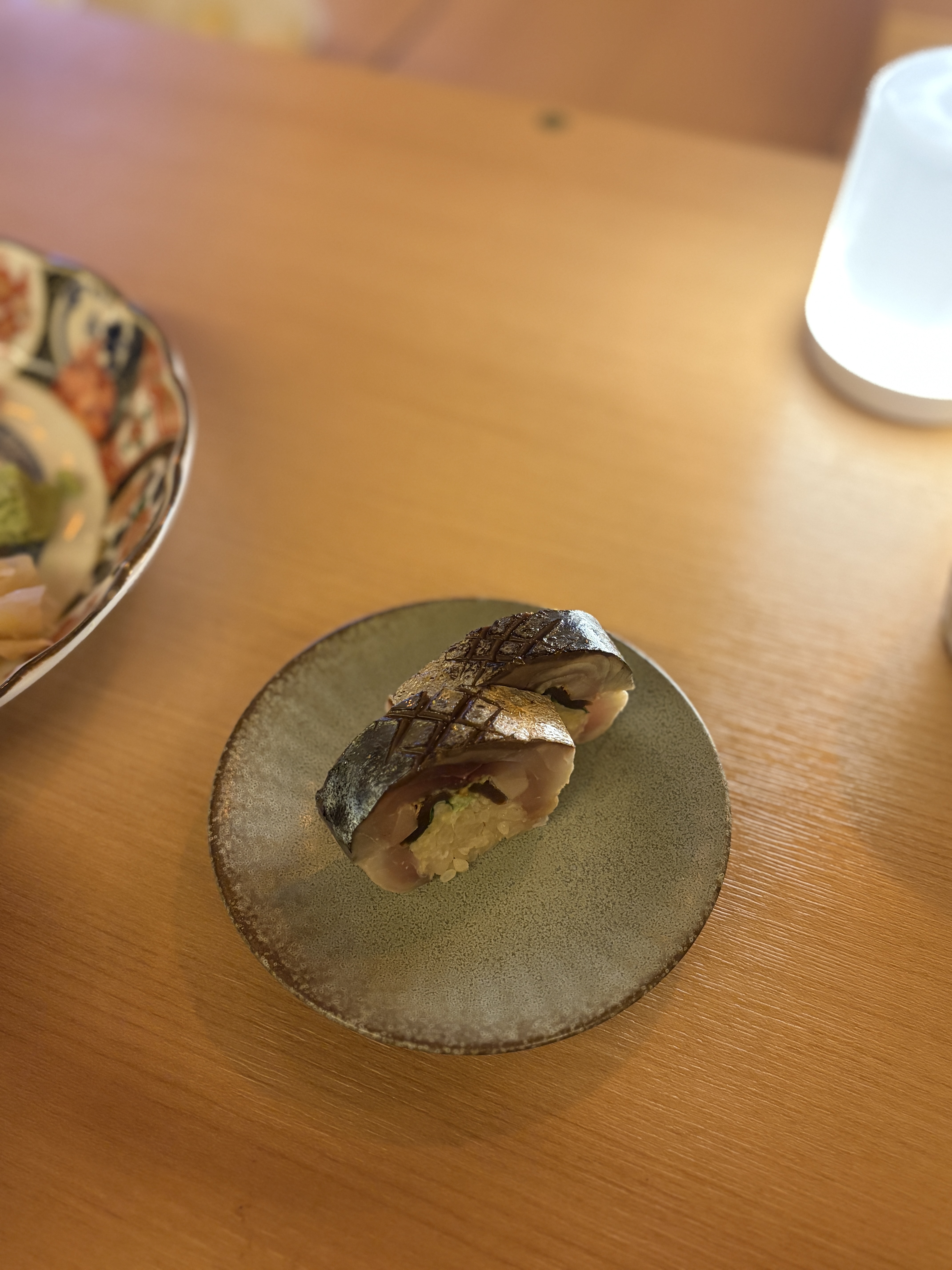 이윽고 나온 사바보우즈시. 시메해둔 사바를 내용물을 넣고 즉석에서 말고 아부리까지 해서 나옵니다. 적당히 산미도 있고 달달함도 있는 맛있는 사바보우즈시였어요.