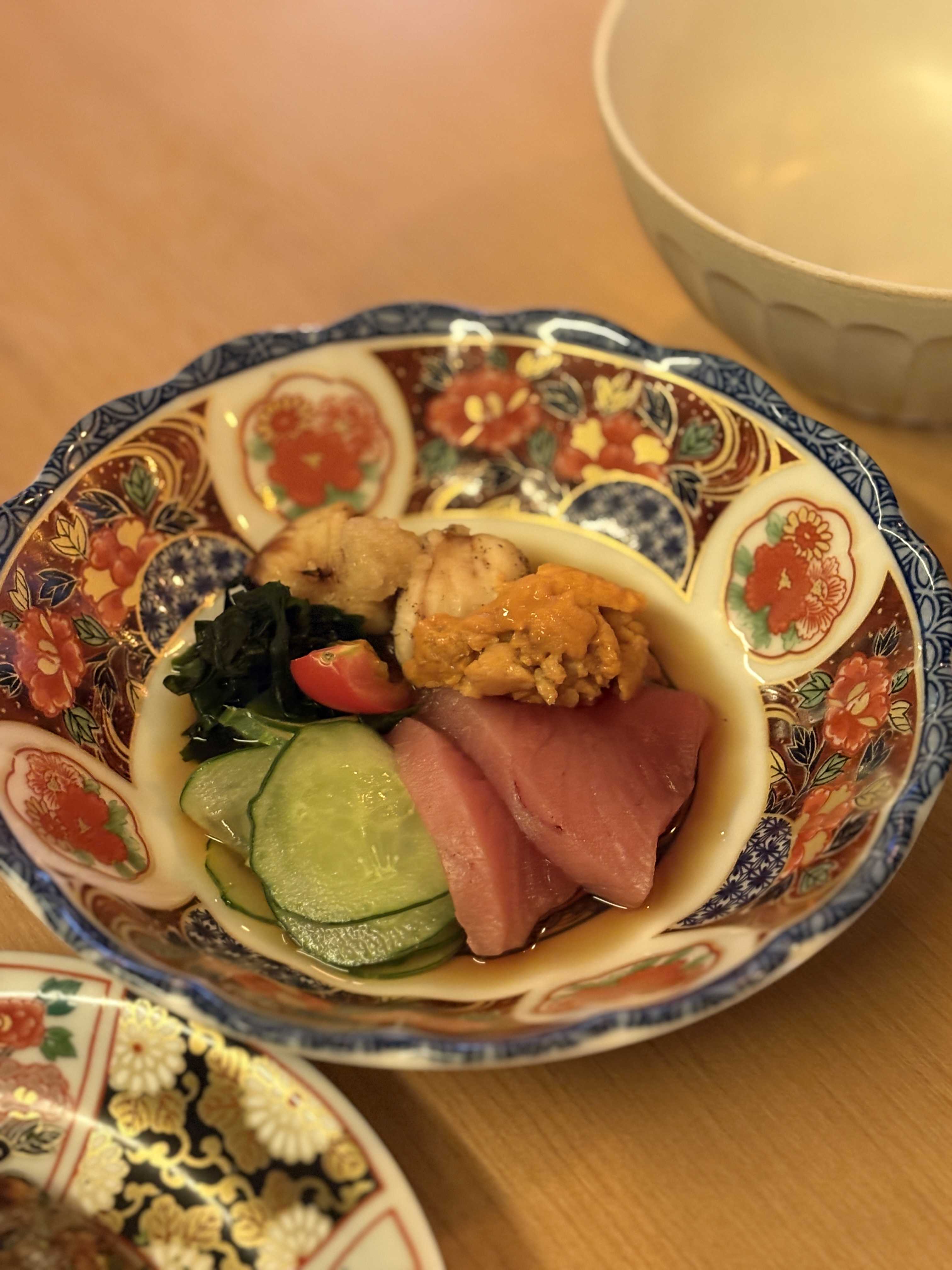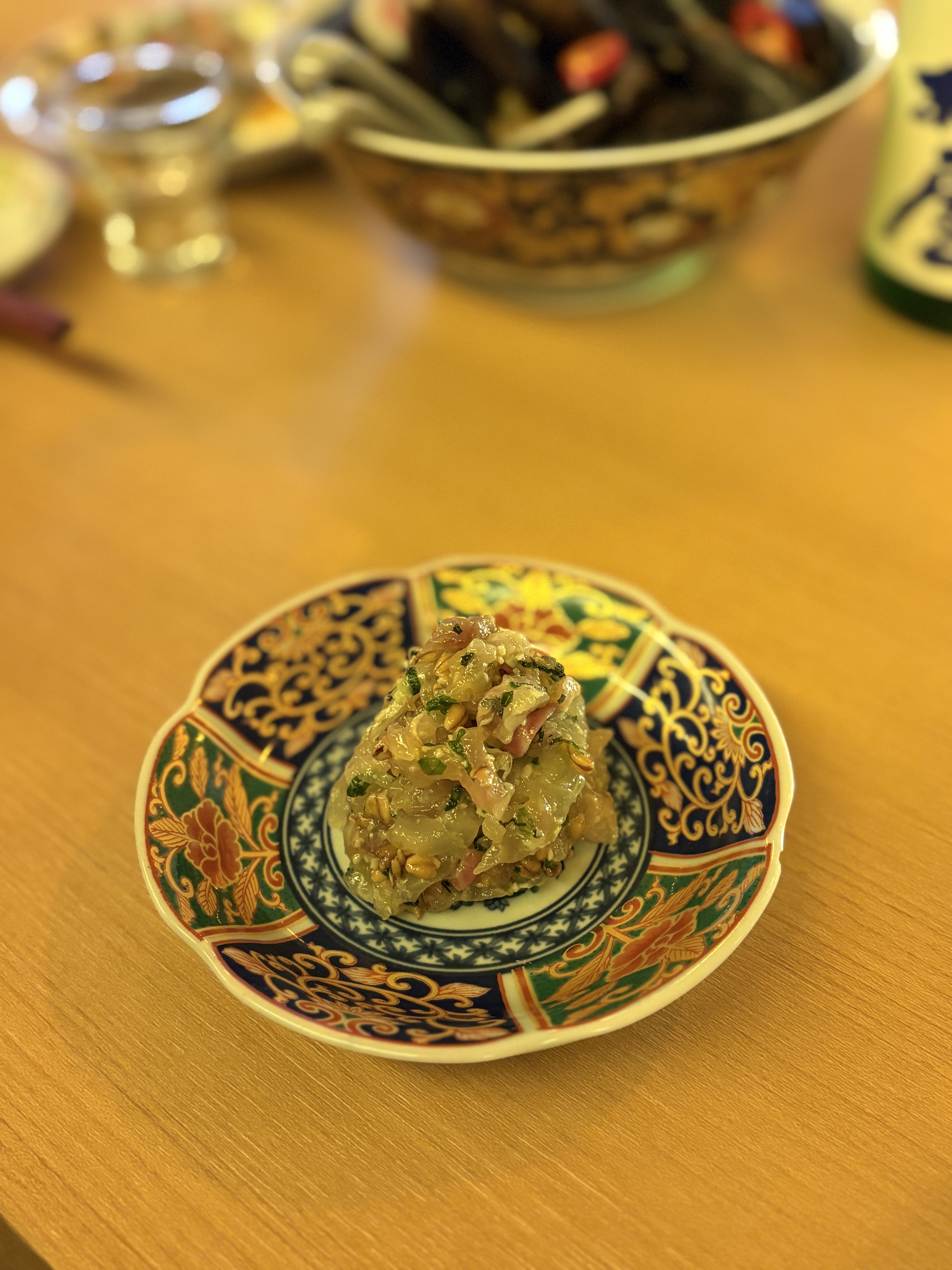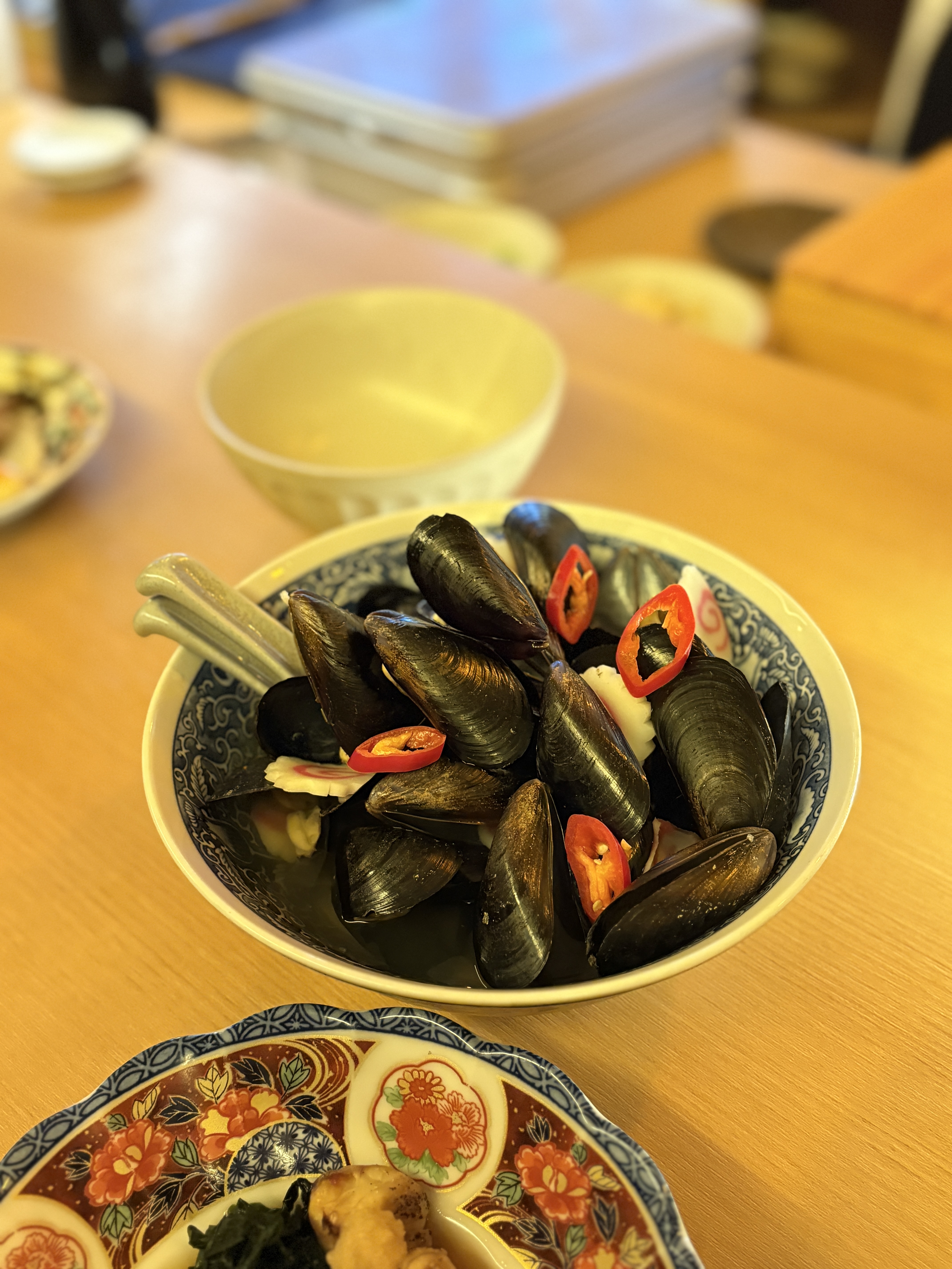 여기가 오마카세가 아닌 술집 안주요리라고 말씀드리는 이유가 초반에 이런 요리들이 나오는 속도가 상당히 빠릅니다. 뭔가 나와서 사진 찍고 있는데 이미 다음 요리가 나오고 있어요.. 홍합이 잔뜩 들어간 국물요리가 나오는데 사실 우리나라에서 이 홍합탕이 그렇게 고급스런 이미지가 아니여서 그런지 차라리 잘 만들어진 오뎅탕이나 곤약졸임 같은게 나왔으면 더 반가웟을 것 같네요. 그래도 탕은 먹다가 식으면 다시 데워주시기도 하고 서비스적으론 좋습니다.