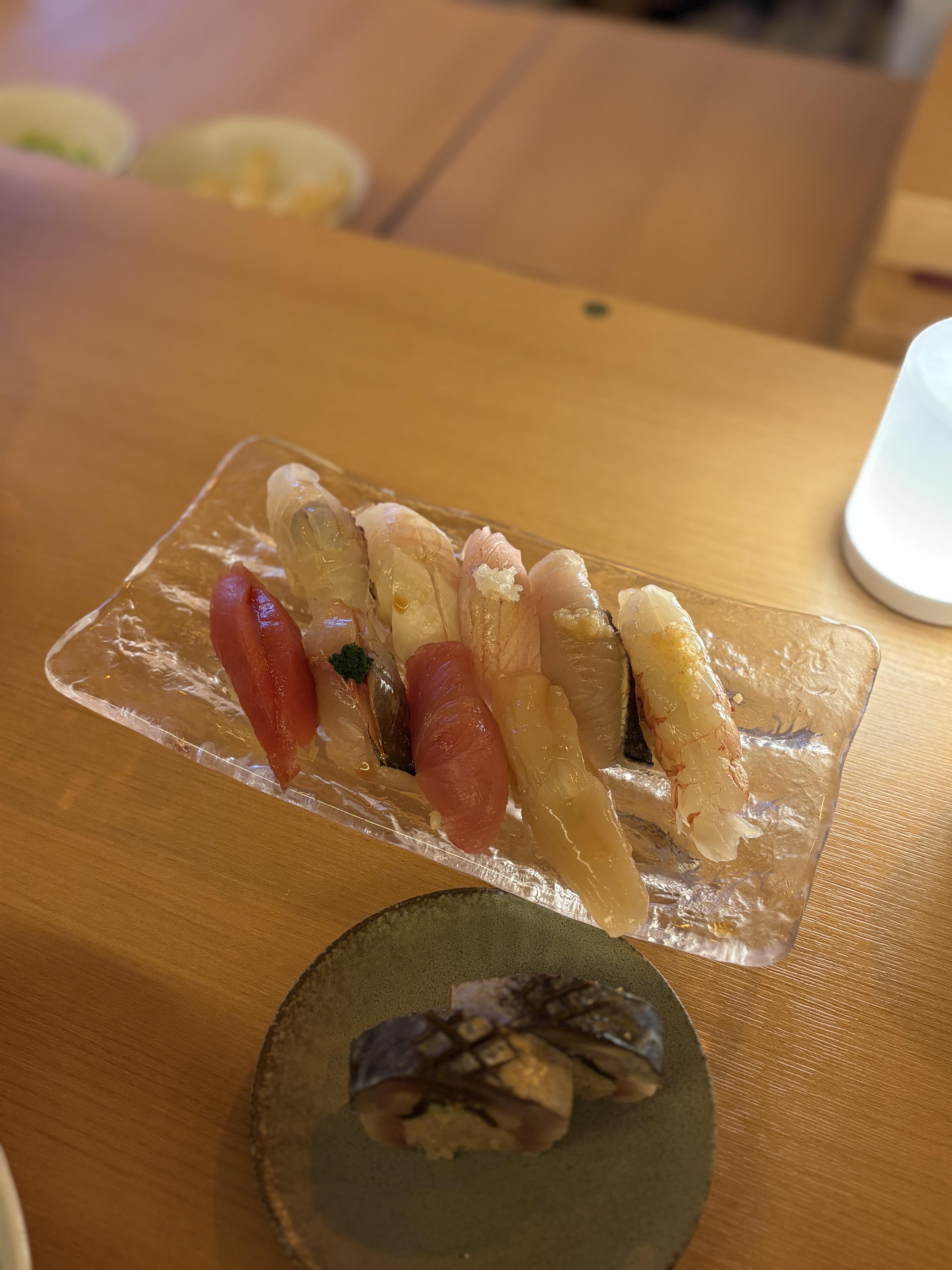 다음은 본격적으로 스시입니다. 판스시 형태로 나오구요, 이건 바로 만들어 주셨습니다. 사시미 모리아와세와 다른건 조개랑 새우 정도.. 그리고 이게 둘이서 먹는 시스템으로 되어있는데요, 스시 먹는 종류의 다양성 때문에 이렇게 주신다고는 하셨는데 둘이 가서 한종류당 한피스씩 나오니까 좀 그렇더라구요 ㅠㅠ 누군 먹고 누군 못먹고.. 사실 미식 경험이란게 같이 가서 먹으면 그 같이 한 경험을 공유하는게 의미있다고 생각하는데.. 누군 먹어보고 누군 안먹어보고 하니 이건 좀 그런거같아요.