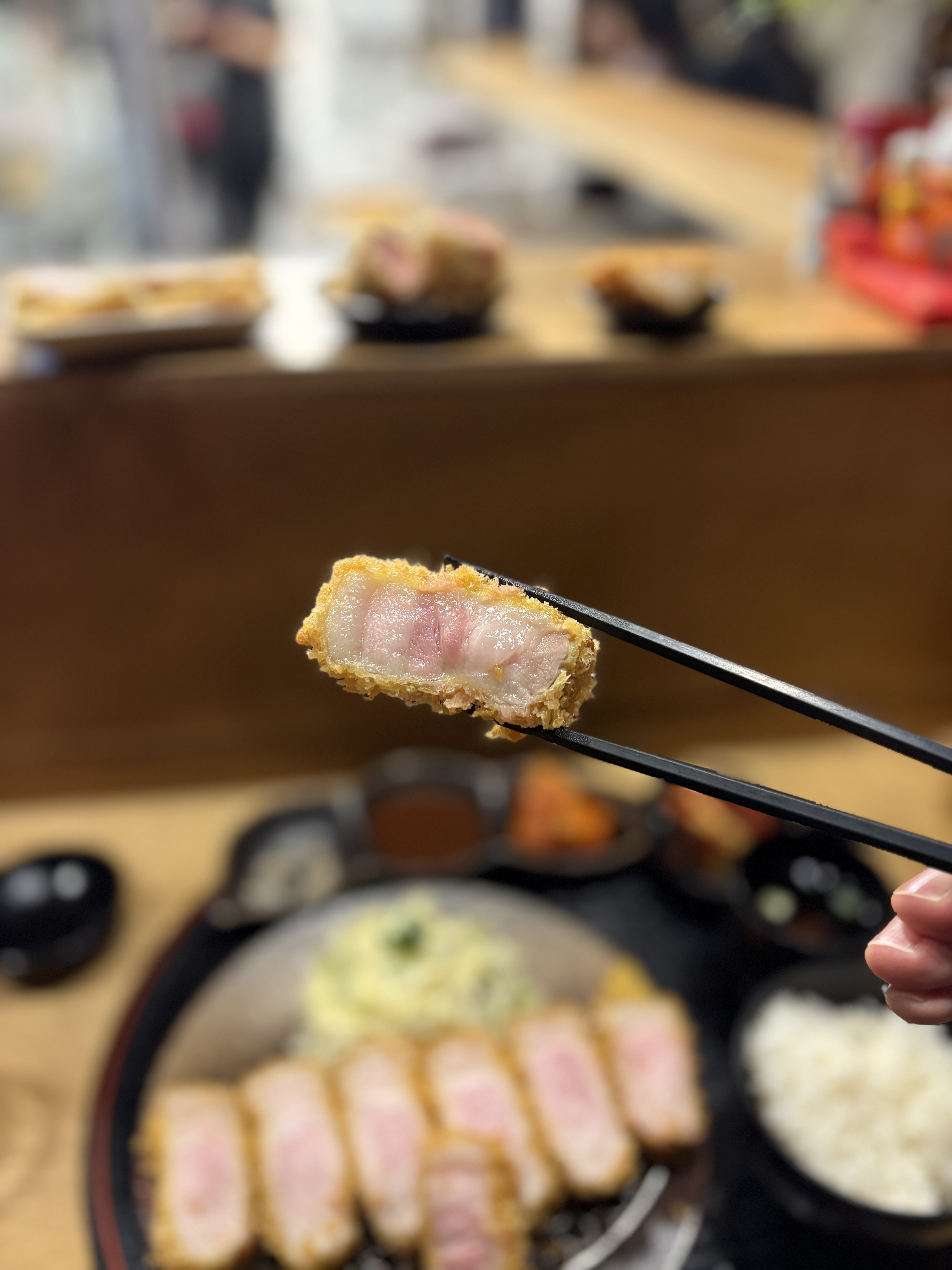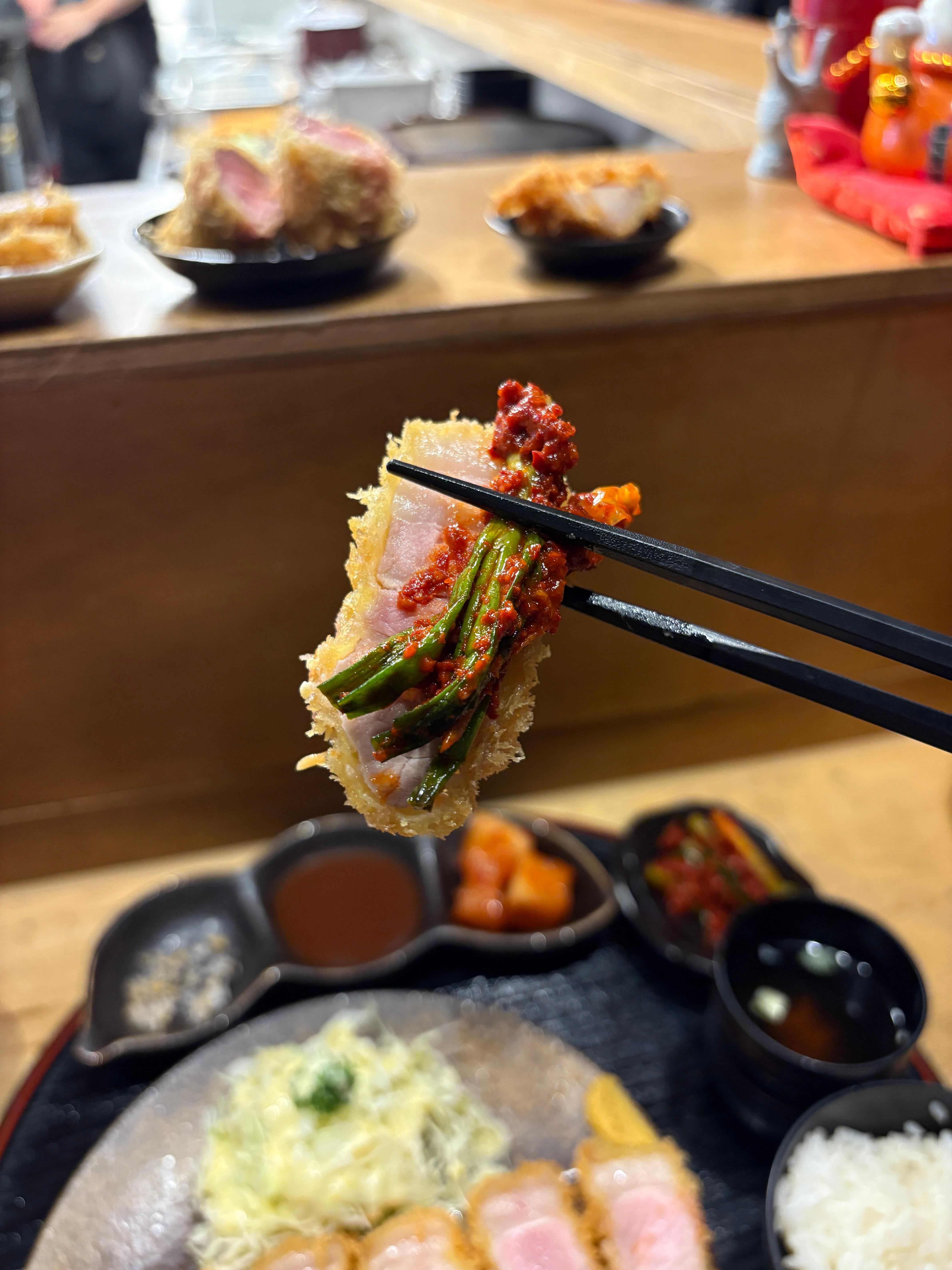 돈카츠는 등심->안심 순으로 먹는거라고 배웠습니다.. 보이시나요 안심의 촉촉한 육질이.. 젓가락으로 꽉 쥐었을 때 핏물이 흘러나오는게 아니라 맑은 육즙이 맺히듯이 보이다가 사라지는.. 말그대로 완벽한 히레카츠입니다.