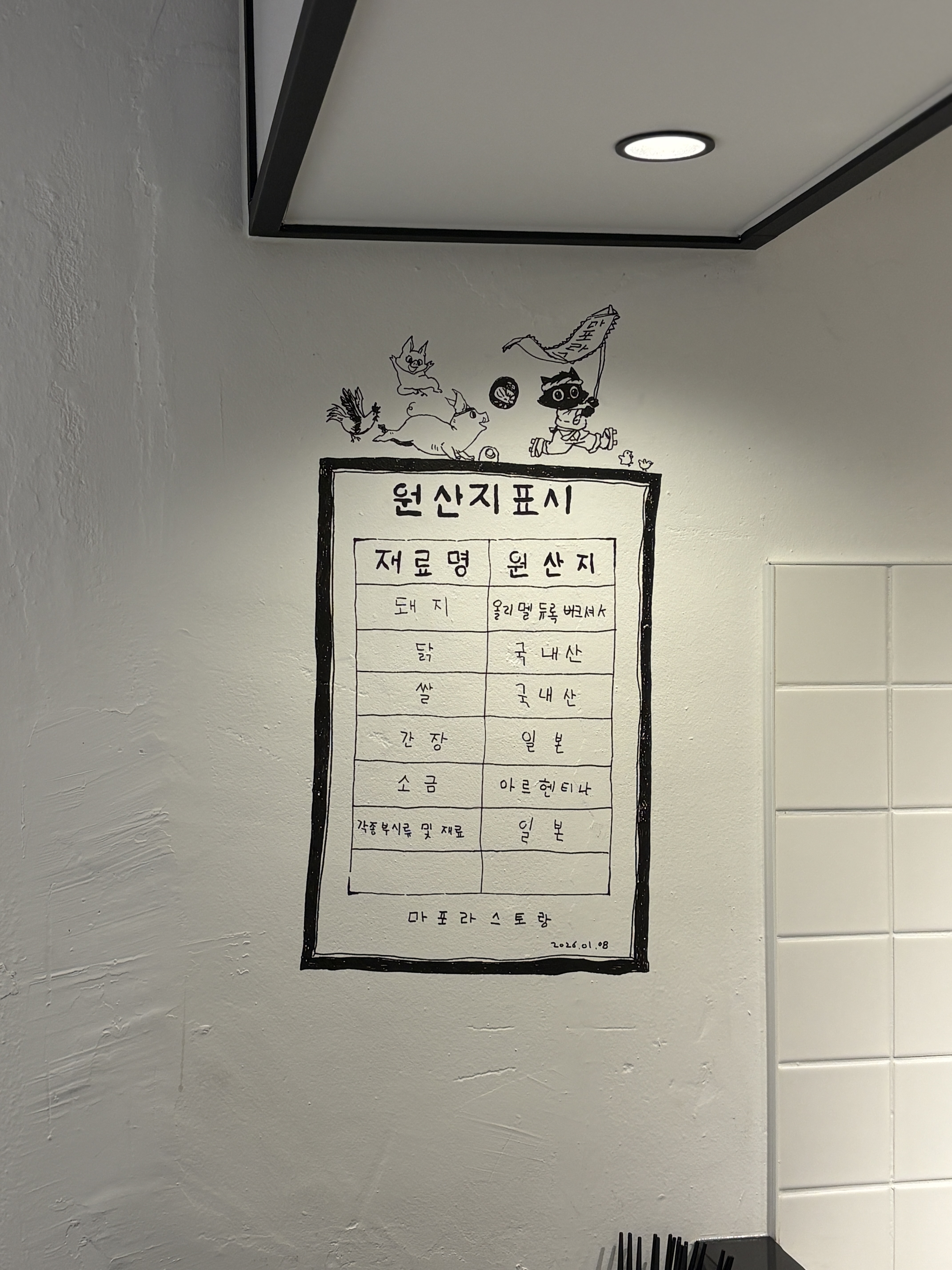 원산지 표시도 벽에다가 직접 그려서 써주셨는데 이게 또 만화같고 재미가있네요 ㅎㅎ 돼지와 소금의 원산지가 눈에 띕니다.