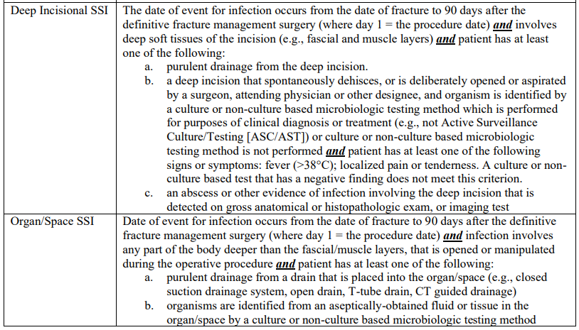 본 연구를 통해서 결과값으로 수집한 자료는 우선 수술부위의 감염 (Surgical Site Infection) 입니다. 여기에는 수술 후 30일 이내에 발생한 수술을 위해 절개한 부위의 표재성 감염 및 90일 이내에 발생한 심부 감염 및 골/근육 등의 장기 감염을 포함합니다. 표재성 감염의 경우에는 국소적인 발적과 감염에 의한 고름 등의 삼출액이 보이는 경우를 포함하였으며, 단순 봉와직염이나 봉합사(실) 주변의 감염으로 인한 미세한 농의 경우에는 제외시켰습니다.