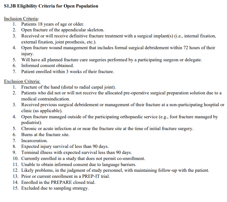 환자군은 폐쇄성 골절과 개방성 골절 환자군으로 나뉘어졌으며, 모든 환자는 18세 이상의 다른 기타 부위 감염이 없는 환자들에서 선별되었습니다. 폐쇄성 골절군의 경우에는 하지의 골절이나 골반 골절 환자군만 포함시켰습니다. 개방성 골절군에 해당하는 환자는, 수상 후 72시간 내에 변연절제 (열린 상처를 씻고 죽은 조직들을 제거하여 추가적인 감염을 예방하는 술기) 등 감염의 위험에 대한 처치를 받는 환자들로 추려졌습니다. 이 과정에서, 상대적으로 감염의 확률이 낮은 수부의 개방성 골절 환자나, 타 병원에서 변연절제술을 시행받은 환자는 제외시켰습니다.