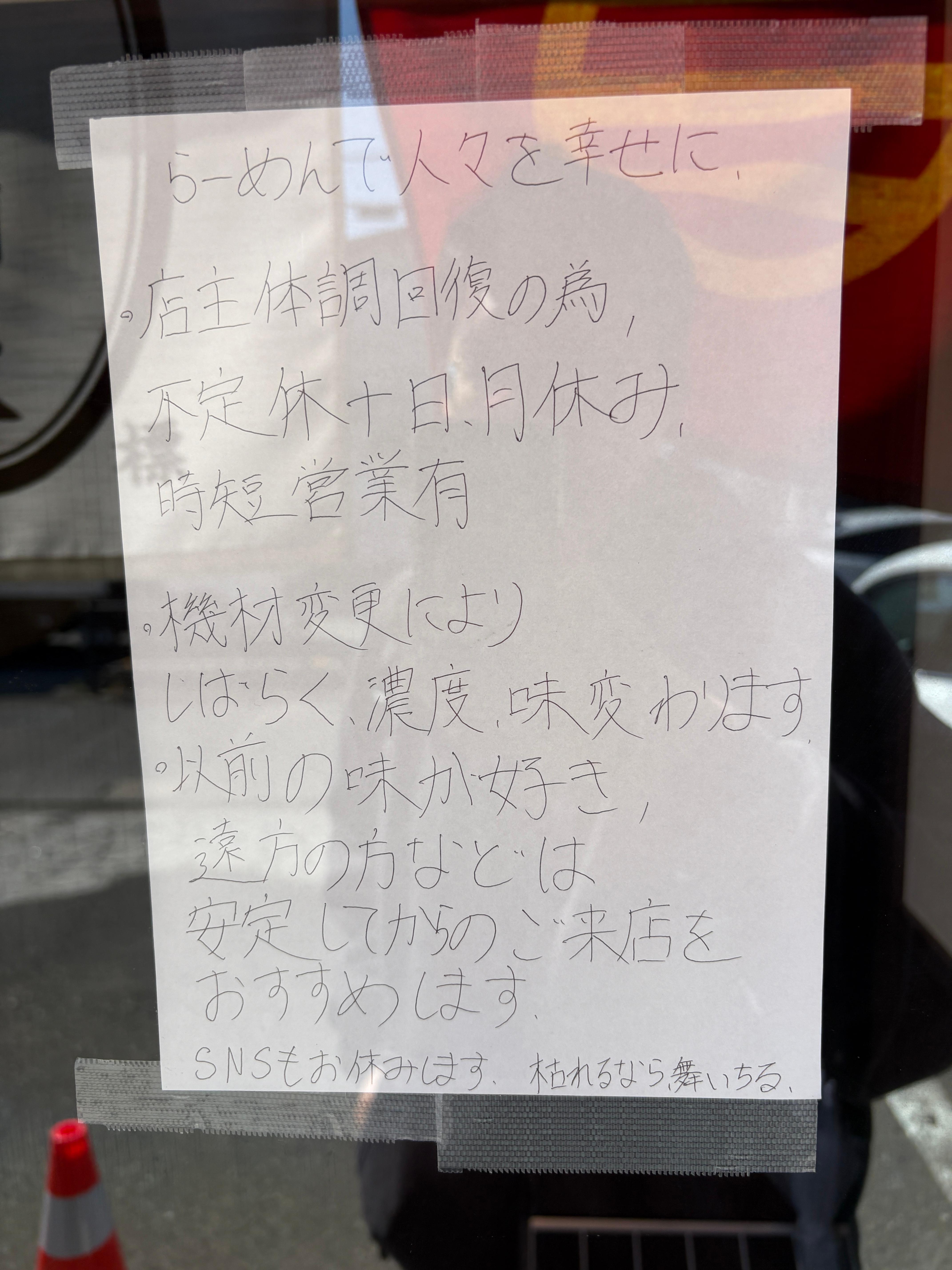그런 상남자 스타일과는 다르게 최근 SNS 게시글을 보면 과로로 인한 것인지 건강으로 인한 임시 휴무 공지가 올라오는 경우가 있습니다. 정확하게 어떻게 아프신 건지는 모르겠지만, 아무래도 부부 두분이서 운영하시는 곳이고 만드시는 라멘이 고강도의 노동력이 필요한 것이어서 그런지 정규 영업일을 줄이고 휴무일을 넣으신 것 같더라구요. 요즘 포스팅을 보면 직원 구인 중인 것 같던데 모쪼록 좋은 인력 뽑으셔서 행복한 라멘 하셨으면 좋겟습니다 (__)