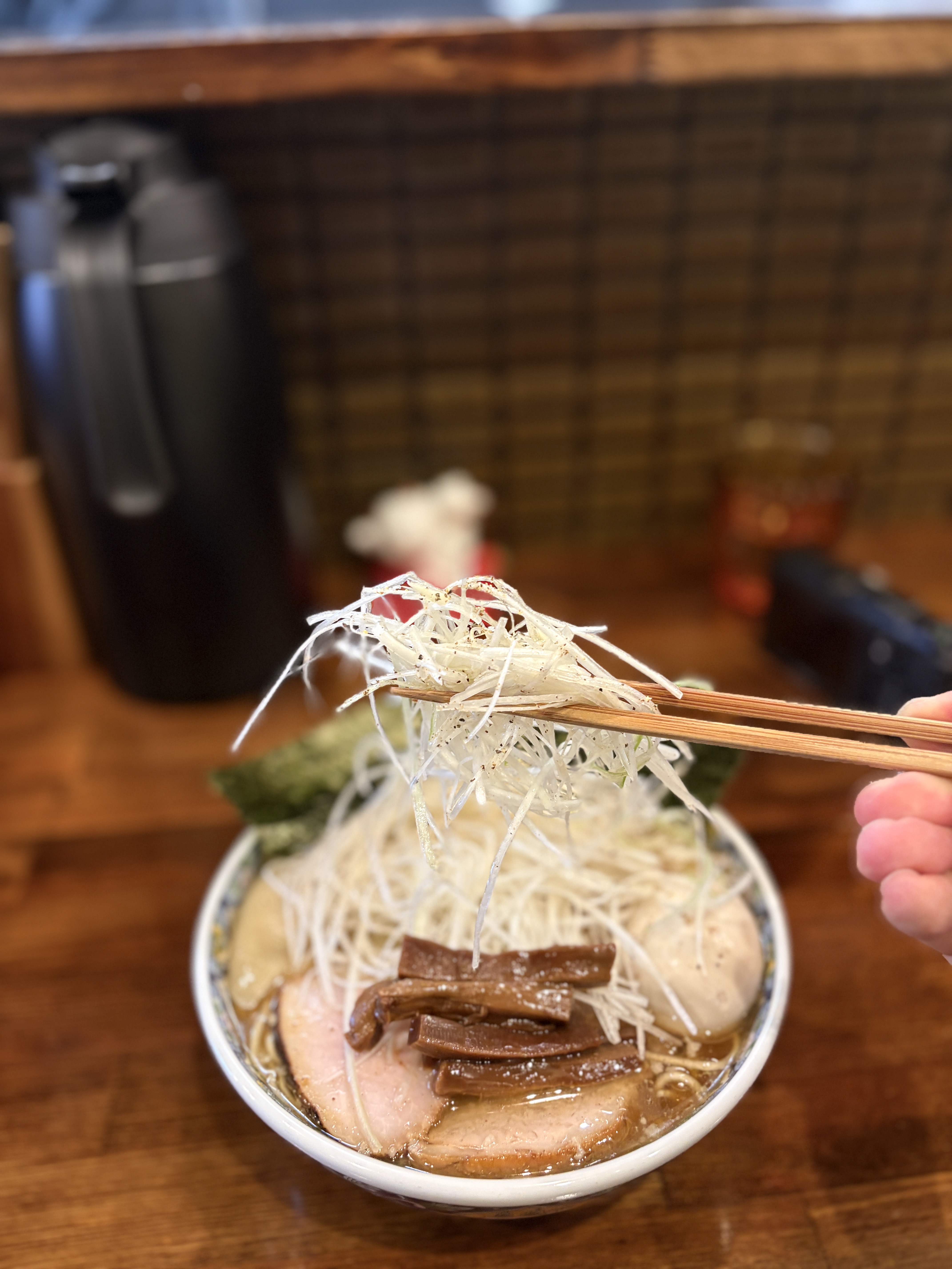 여러 후기들 중에 흰 대파인 시로네기(白ネギ)를 추가한 사진을 보아서 꼭 해보고 싶어서 도전했습니다. 대파 추가는 200엔으로 가격만 보면 음? 스럽지만 나온 양을 보면 이해가 된다는..ㅋㅋ 정말 산더미처럼 파를 쌓아 올려줍니다.
