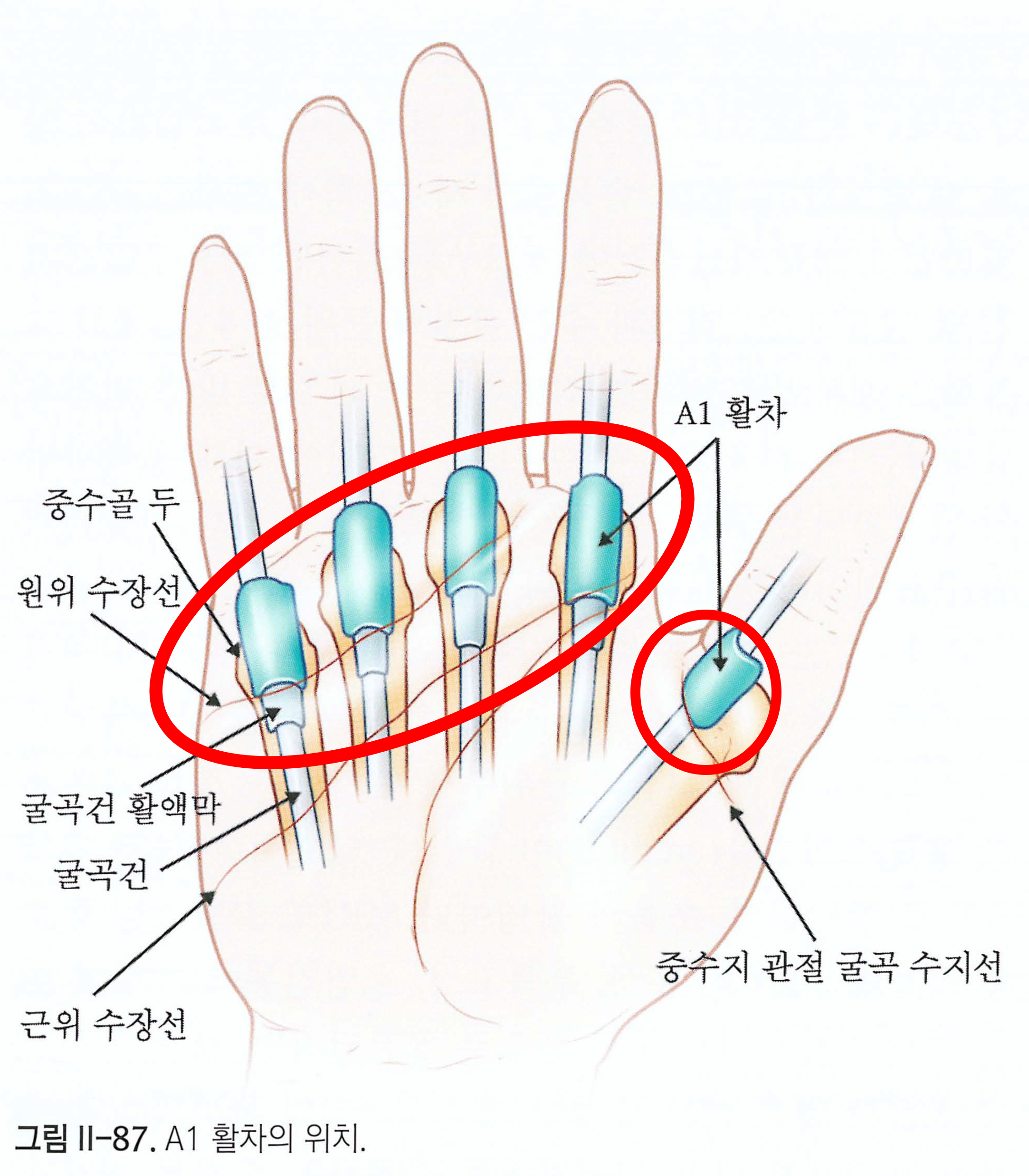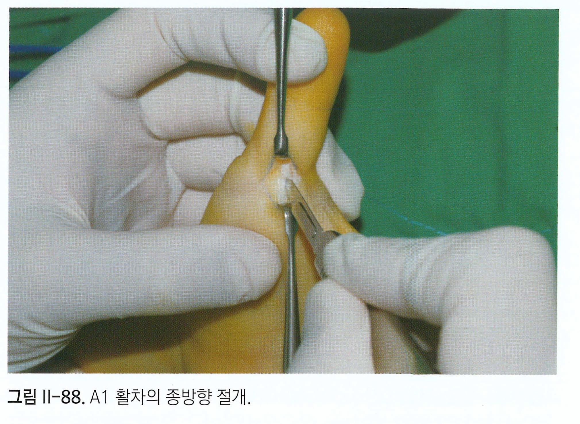 수술 방법은 인대가 아닌 인대를 덮고 있는 A1 활차를 손보게 됩니다. A1 활차의 문제가 아닌 인대가 비후되었다고 하더라도, 인대를 잘라낼 수는 없겠지요? 따라서 인대의 주행을 방해하는 A1 활차를 종방향으로 갈라서 인대가 움직이는 공간의 숨통을 트이게 해주는 것이 수술 방법입니다.