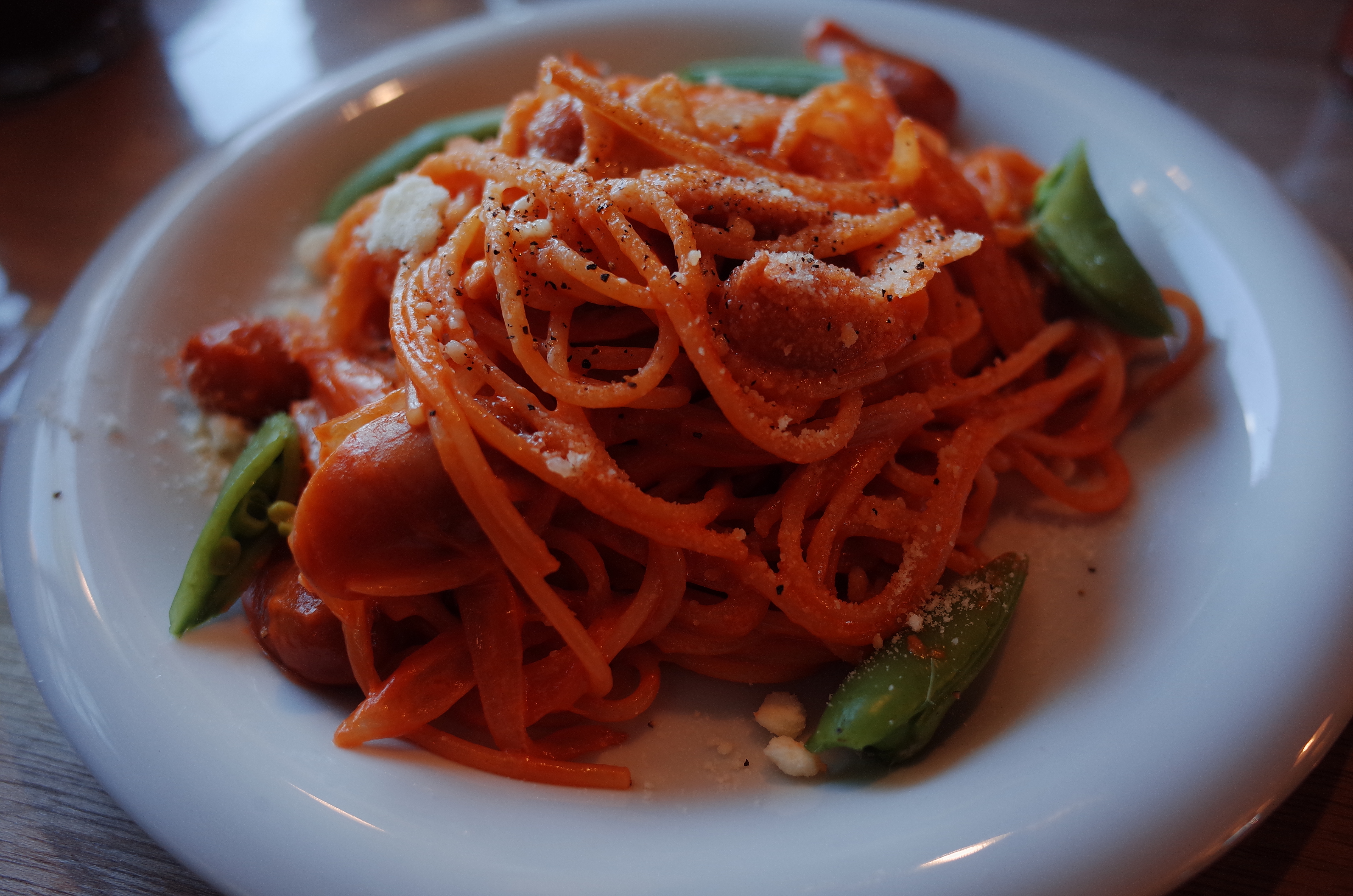 제가 시킨 나폴리탄 파스타가 나왔습니다. 나폴리탄 파스타 자체가 워낙 들어가는 재료가 기본적이긴 하지만, 실제로 집에서 만들어 보신 분은 알다시피 그 기본적인 맛을 충실하게 내는 것이 상당히 힘듭니다. 베이스가 토마토 소스가 아닌 케챱으로 맛을 내기때문에, 케챱의 양에도 상당히 민감한 편이구요, 파마산 치즈와 면에서 나오는 전분을 통해서 만테카레 형식으로 휘저어 주면서 소스의 농도를 완성하게되는데, 이 과정에서 자칫하면 너무 물기가 없어져서 먹기가 불편하고, 너무 물기가 많으면 나폴리탄 특유의 꾸덕함이 안느껴지기 때문입니다. 카페티노의 나폴리탄은 이런 기본에 아주 충실한 맛이었고, 오쿠라를 곁들여 주어서 식감의 재미도 잘 살아있었습니다. 면의 익힘 정도도 완벽했구요. 최근 먹어본 나폴리탄 중에 가장 요리다운 나폴리탄이었습니다.