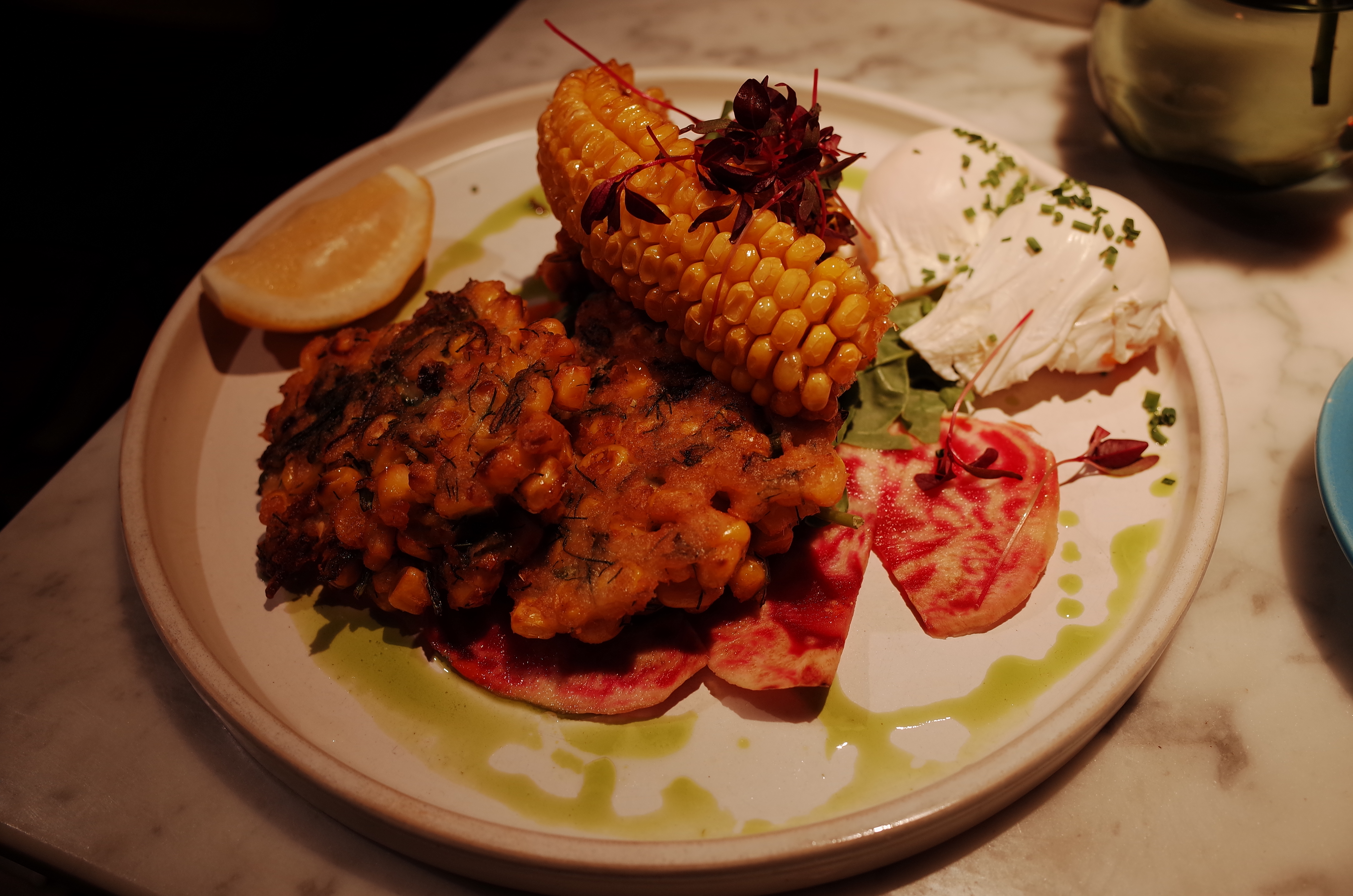 두번째 플레이트로 주문한 Sweetcorn fritters (£15.5) 뭔가 다른 음식점들도 돌아다니면서 메뉴를 봤을 때, 런던에서 인기있는 재료가 corn rib인것 같습니다. 갈비처럼 옥수수를 포셔닝해서 구워주는데요, 옥수수 자체의 맛이 극한으로 올라가있어 맛이 없을 수가 없는 메뉴입니다. 그리고 메인 메뉴는 사실 우리나라 옥수수전이랑 같은 맛이라서 웃겼습니다 ㅋㅋ 맛은 있는데 뭔가 좀더 새로운 맛을 경험하고 싶어 다시간다면 이 메뉴는 피할 것 같은 느낌이..