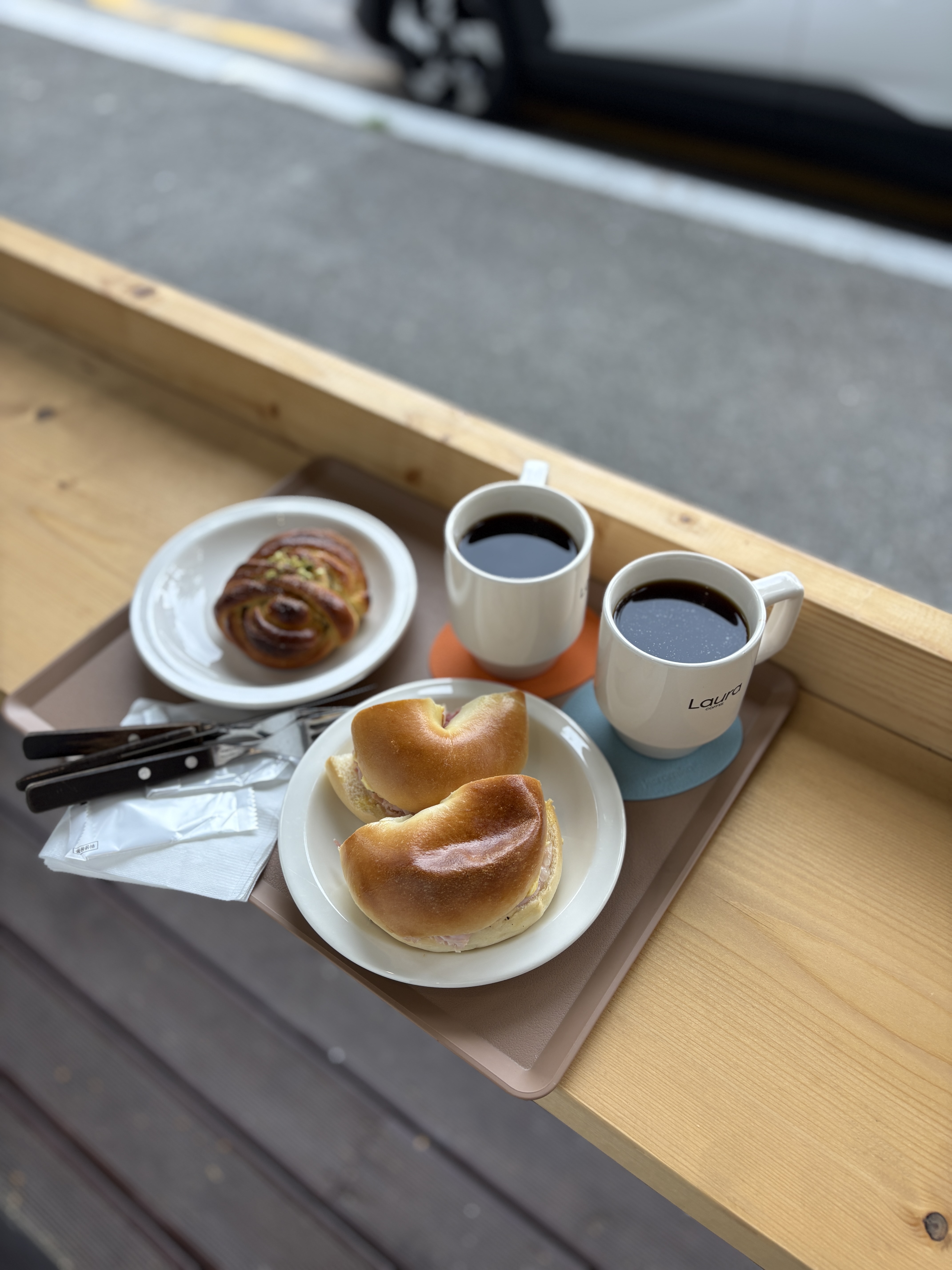주문한 메뉴를 들고 야외석으로 나왔습니다. 햇살도 강하지 않고 날씨도 선선해서 야외에서 먹기 정말 최적인 날씨였습니다.