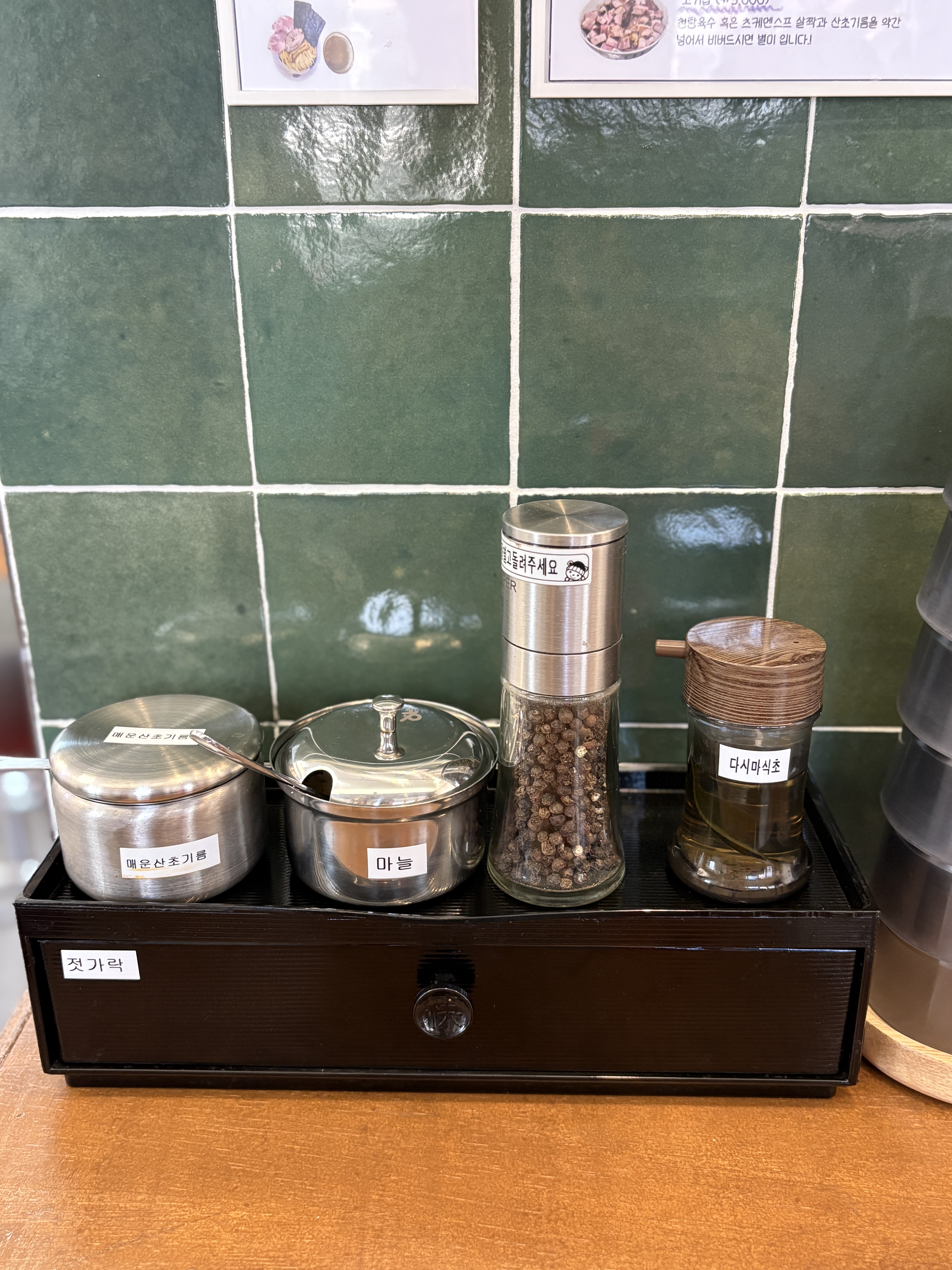 곁들임류 구성입니다. 마늘은 국물이 있는 라멘에 넣어 먹을 수 있는 녀석이구요, 매운산초기름과 후추, 제가 좋아하는 다시마식초가 있습니다.