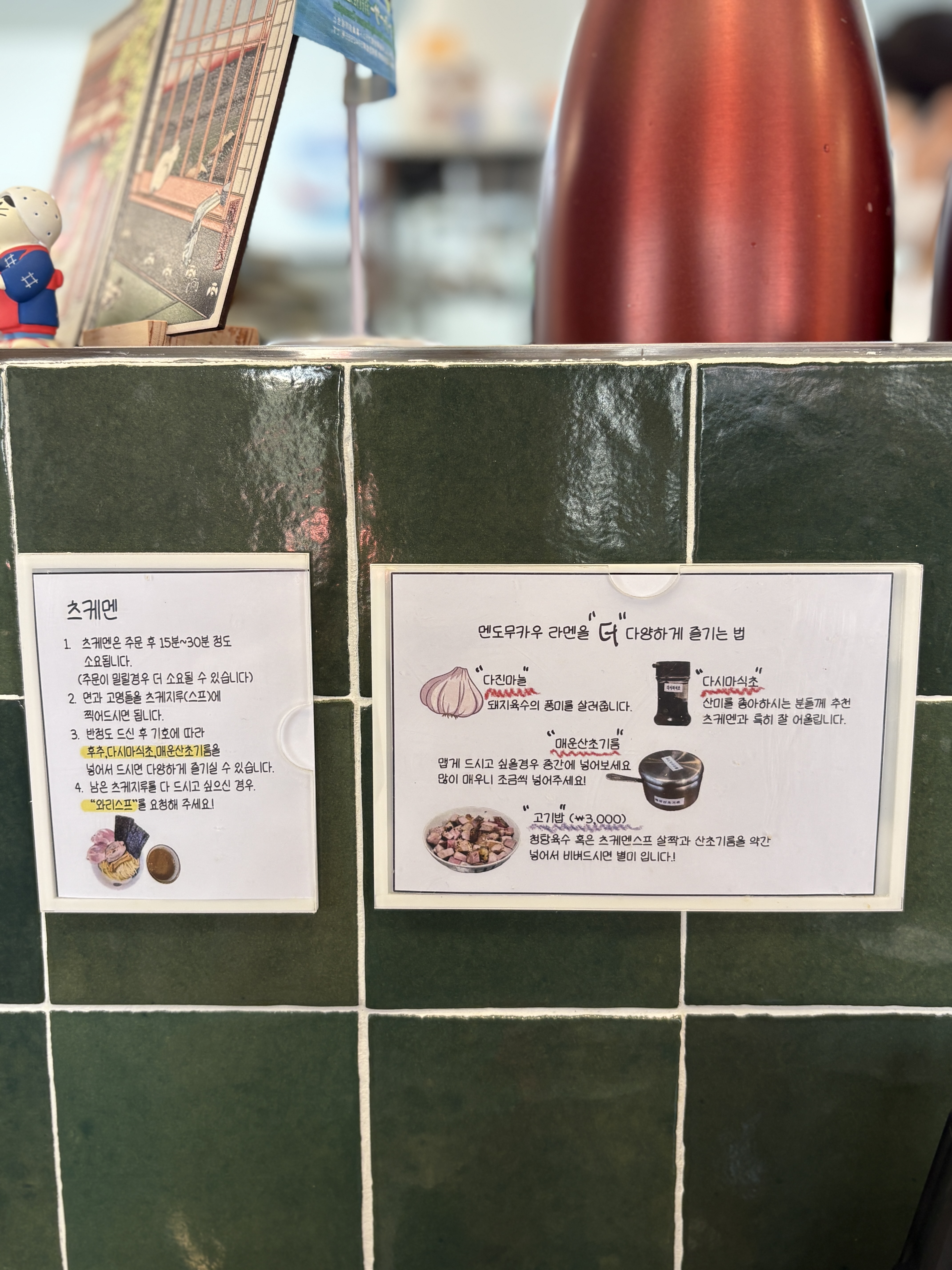 홍대 일대에서 츠케멘으로 주목받고 있는 라멘야 가운데 하나인 멘도무카우. 그 명성에 걸맞는 만족스러운 츠케멘이었습니다. 저도 양이 줄었는지 300g은 좀 많은 것 같고 다음에는 보통 사이즈로 차슈만 추가해서 먹어봐야겠네요. 시그니쳐인 카라시오도 다음엔 와이프랑 같이 와서 맛보길 기대해봅니다 ㅎㅎ